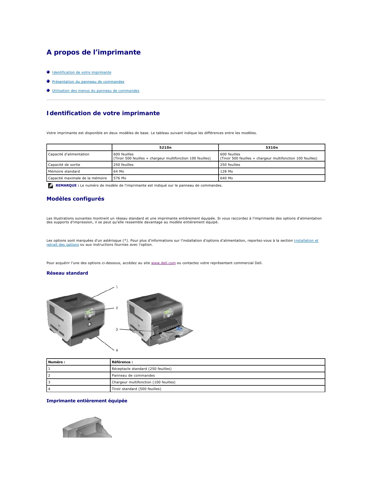 A propos de l’imprimante Identification de votre imprimante Présentation du panneau de commandes Utilisation des menus du panneau de commandes Identification de votre imprimante Votre imprimante est disponible en deux modèles de base. Le tableau suivant indique les différences entre les modèles. 5210n 5310n Capacité d'alimentation 600 feuilles (Tiroir 500 feuilles + chargeur multifonction 100 feuilles) 600 feuilles (Tiroir 500 feuilles + chargeur multifonction 100 feuilles) Capacité de sortie 250 feuilles 250 feuilles Mémoire standard 64 Mo 128 Mo Capacité maximale de la mémoire 576 Mo 640 Mo REMARQUE : Le numéro de modèle de l'imprimante est indiqué sur le panneau de commandes. Modèles configurés Les illustrations suivantes montrent un réseau standard et une imprimante entièrement équipée. Si vous raccordez à l'imprimante des options d'alimentation des supports d'impression, il se peut qu'elle ressemble davantage au modèle entièrement équipé. Les options sont marquées d'un astérisque (*). Pour plus d'informations sur l'installation d'options d'alimentation, reportez-vous à la section Installation et retrait des options ou aux instructions fournies avec l'option. Pour acquérir l'une des options ci-dessous, accédez au site www.dell.com ou contactez votre représentant commercial Dell. Réseau standard Numéro : Référence :