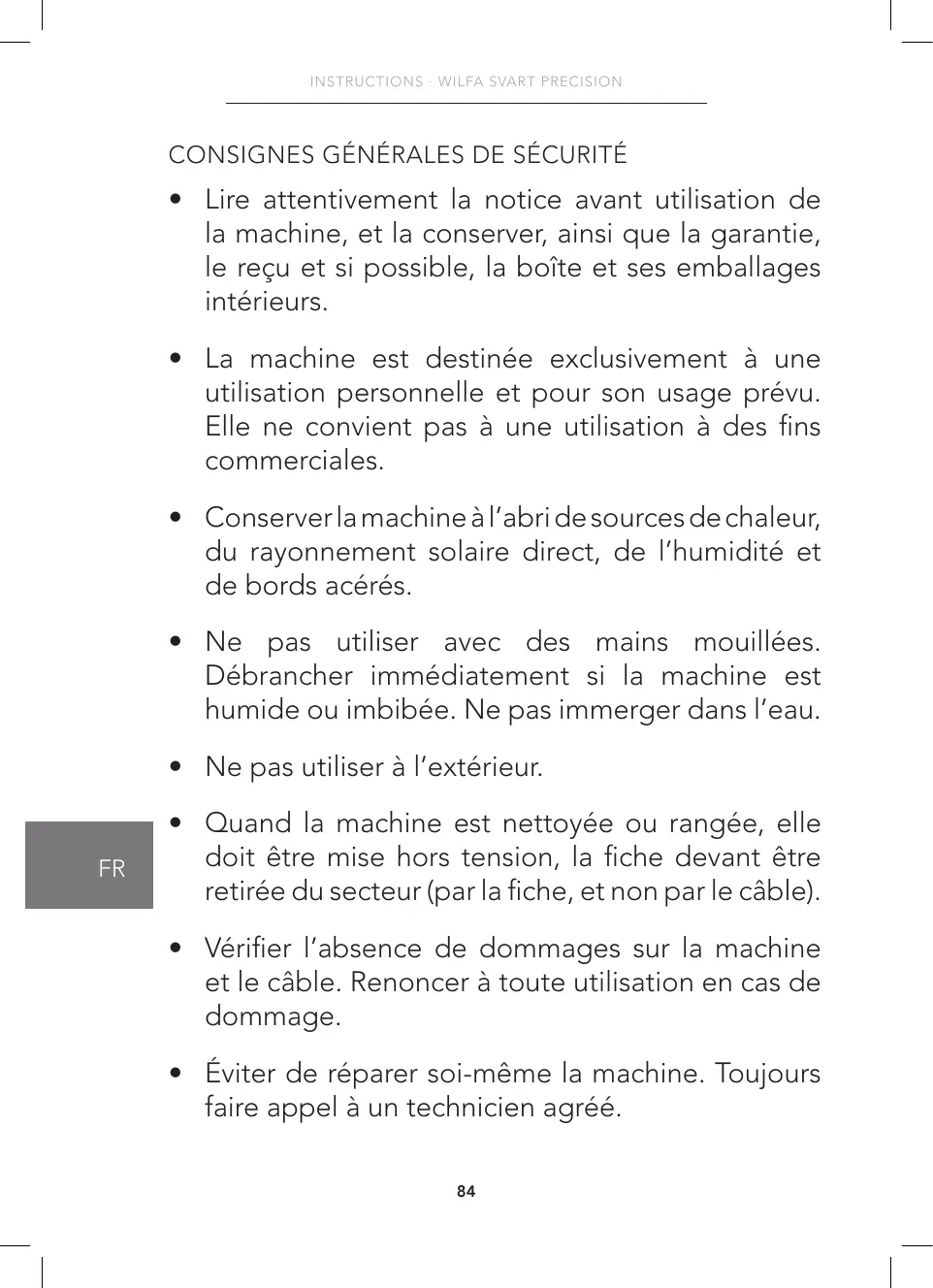 GARANTIE Wilfa accorde une garantie de 5 ans sur ce produit à compter de la date d’achat. La garantie couvre les défauts de production ou les anomalies survenant durant la période de garantie. Le reçu d’achat sert de preuve à montrer au détaillant pour tout recours garantie. La garantie n’est valide que sur les produits achetés et utilisés pour un usage domestique. Elle n’est pas valide en cas d’utilisation commerciale du produit. La garantie ne s’applique pas en cas de mauvaise utilisation du produit, de négligence, de non-respect des consignes de Wilfa, de modification ou de réparation non autorisée. La garantie ne s’applique pas non plus en cas d’usure naturelle du produit, de mauvaise utilisation, de défaut d’entretien ou de mise sous tension erronée ou en cas de :
