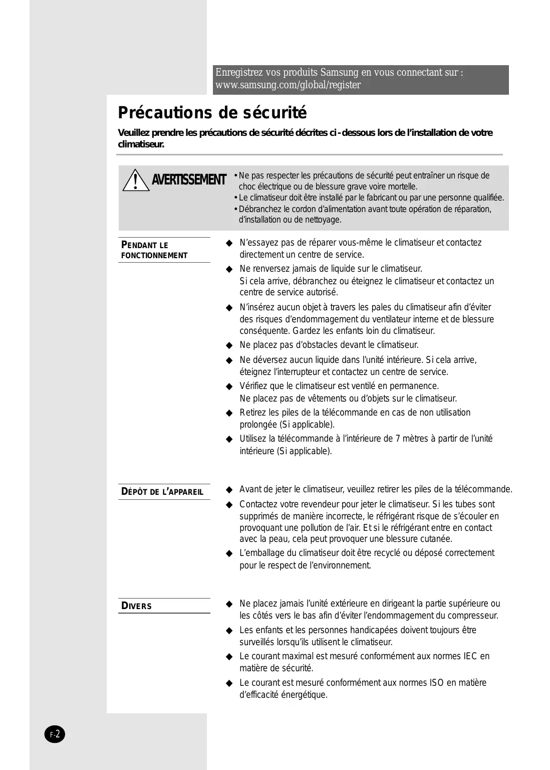 E S F I P D G DB98-20305A(4) Enregistrez vos produits Samsung en vous connectant sur : www.samsung.com/global/register Précautions de sécurité Veuillez prendre les précautions de sécurité décrites ci - dessous lors de l’installation de votre climatiseur. AVERTISSEMENT PENDANT LE FONCTIONNEMENT
