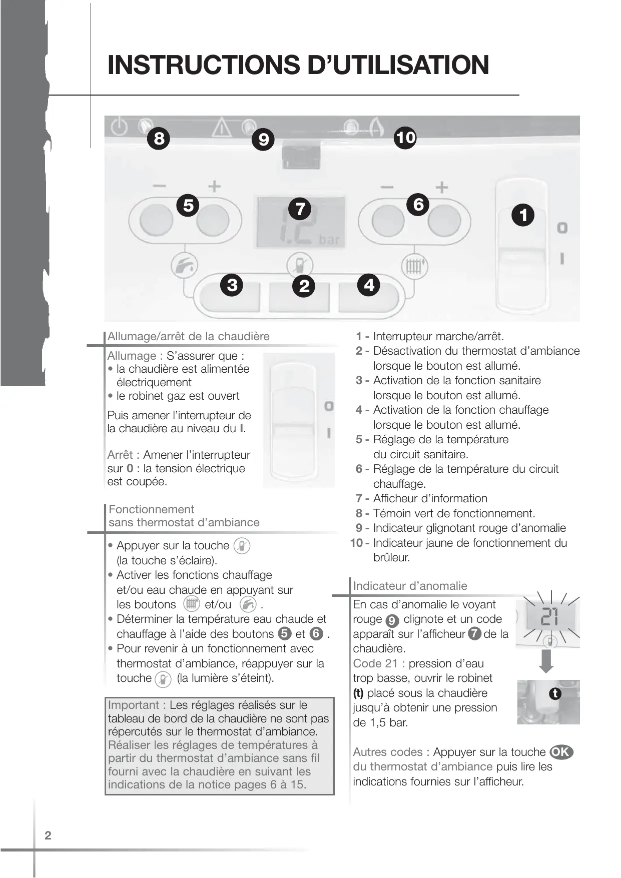 4 1 - Interrupteur marche/arrêt. 2 - Désactivation du thermostat d’ambiance lorsque le bouton est allumé. 3 - Activation de la fonction sanitaire lorsque le bouton est allumé. 4 - Activation de la fonction chauffage lorsque le bouton est allumé. 5 - Réglage de la température du circuit sanitaire. 6 - Réglage de la température du circuit chauffage. 7 - Afficheur d’information 8 - Témoin vert de fonctionnement. 9 - Indicateur glignotant rouge d’anomalie 10 - Indicateur jaune de fonctionnement du brûleur. Indicateur d’anomalie En cas d’anomalie le voyant rouge 9 clignote et un code apparaît sur l’afficheur 7 de la chaudière. Code 21 : pression d’eau trop basse, ouvrir le robinet (t) placé sous la chaudière jusqu’à obtenir une pression de 1,5 bar.