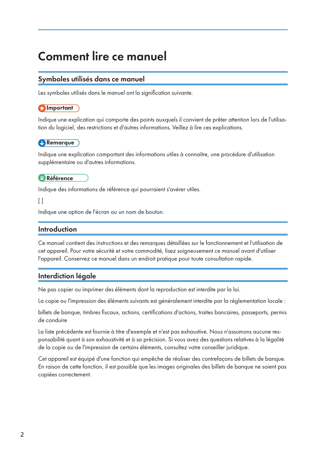 Interdiction légale Ne pas copier ou imprimer des éléments dont la reproduction est interdite par la loi. La copie ou l'impression des éléments suivants est généralement interdite par la réglementation locale : billets de banque, timbres fiscaux, actions, certifications d'actions, traites bancaires, passeports, permis de conduire La liste précédente est fournie à titre d'exemple et n'est pas exhaustive. Nous n'assumons aucune responsabilité quant à son exhaustivité et à sa précision. Si vous avez des questions relatives à la légalité de la copie ou de l'impression de certains éléments, consultez votre conseiller juridique. Cet appareil est équipé d'une fonction qui empêche de réaliser des contrefaçons de billets de banque. En raison de cette fonction, il est possible que les images originales des billets de banque ne soient pas copiées correctement.