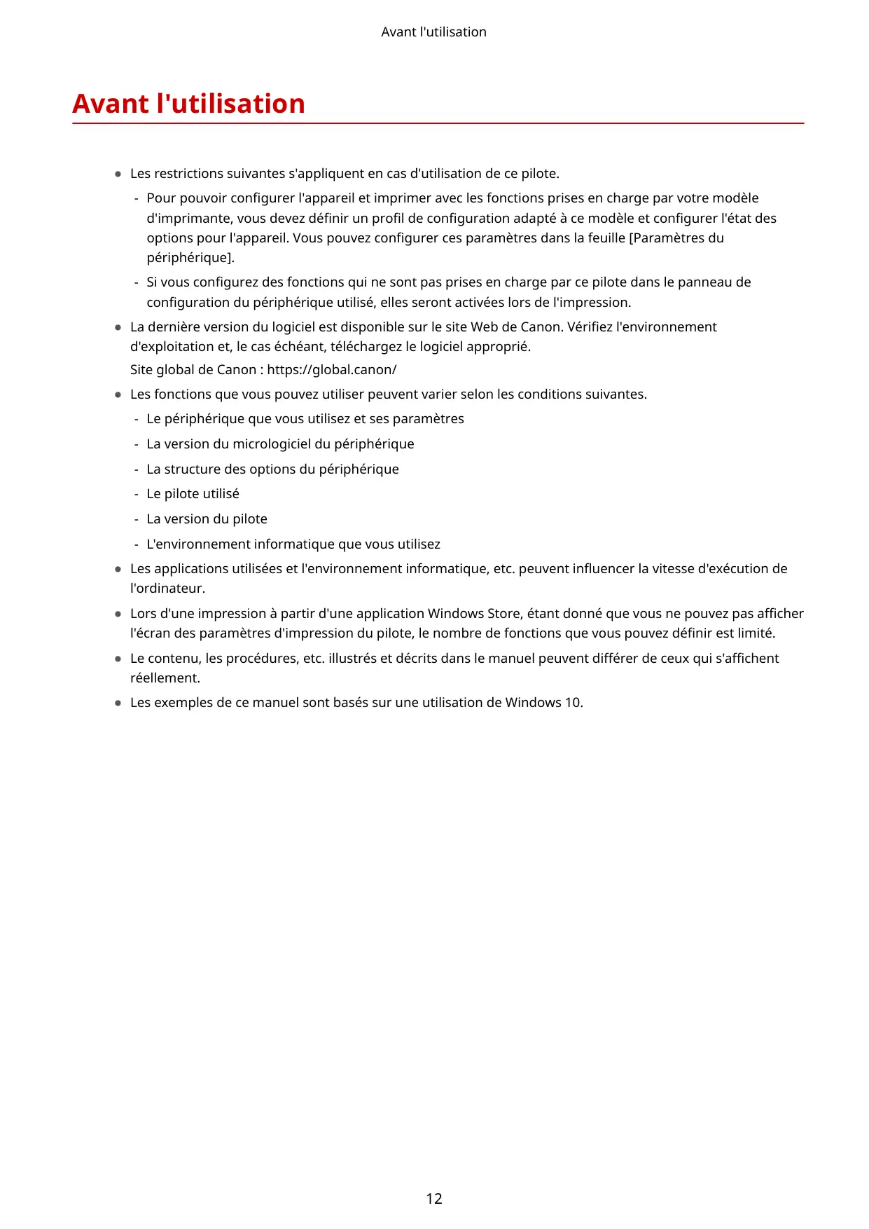Avant l'utilisation Avant l'utilisation ● Les restrictions suivantes s'appliquent en cas d'utilisation de ce pilote. - Pour pouvoir configurer l'appareil et imprimer avec les fonctions prises en charge par votre modèle d'imprimante, vous devez définir un profil de configuration adapté à ce modèle et configurer l'état des options pour l'appareil. Vous pouvez configurer ces paramètres dans la feuille [Paramètres du périphérique]. - Si vous configurez des fonctions qui ne sont pas prises en charge par ce pilote dans le panneau de configuration du périphérique utilisé, elles seront activées lors de l'impression. ● La dernière version du logiciel est disponible sur le site Web de Canon. Vérifiez l'environnement d'exploitation et, le cas échéant, téléchargez le logiciel approprié. Site global de Canon : https://global.canon/ ● Les fonctions que vous pouvez utiliser peuvent varier selon les conditions suivantes. - Le périphérique que vous utilisez et ses paramètres - La version du micrologiciel du périphérique - La structure des options du périphérique - Le pilote utilisé - La version du pilote - L'environnement informatique que vous utilisez ● Les applications utilisées et l'environnement informatique, etc. peuvent influencer la vitesse d'exécution de l'ordinateur. ● Lors d'une impression à partir d'une application Windows Store, étant donné que vous ne pouvez pas afficher l'écran des paramètres d'impression du pilote, le nombre de fonctions que vous pouvez définir est limité. ● Le contenu, les procédures, etc. illustrés et décrits dans le manuel peuvent différer de ceux qui s'affichent réellement. ● Les exemples de ce manuel sont basés sur une utilisation de Windows 10.