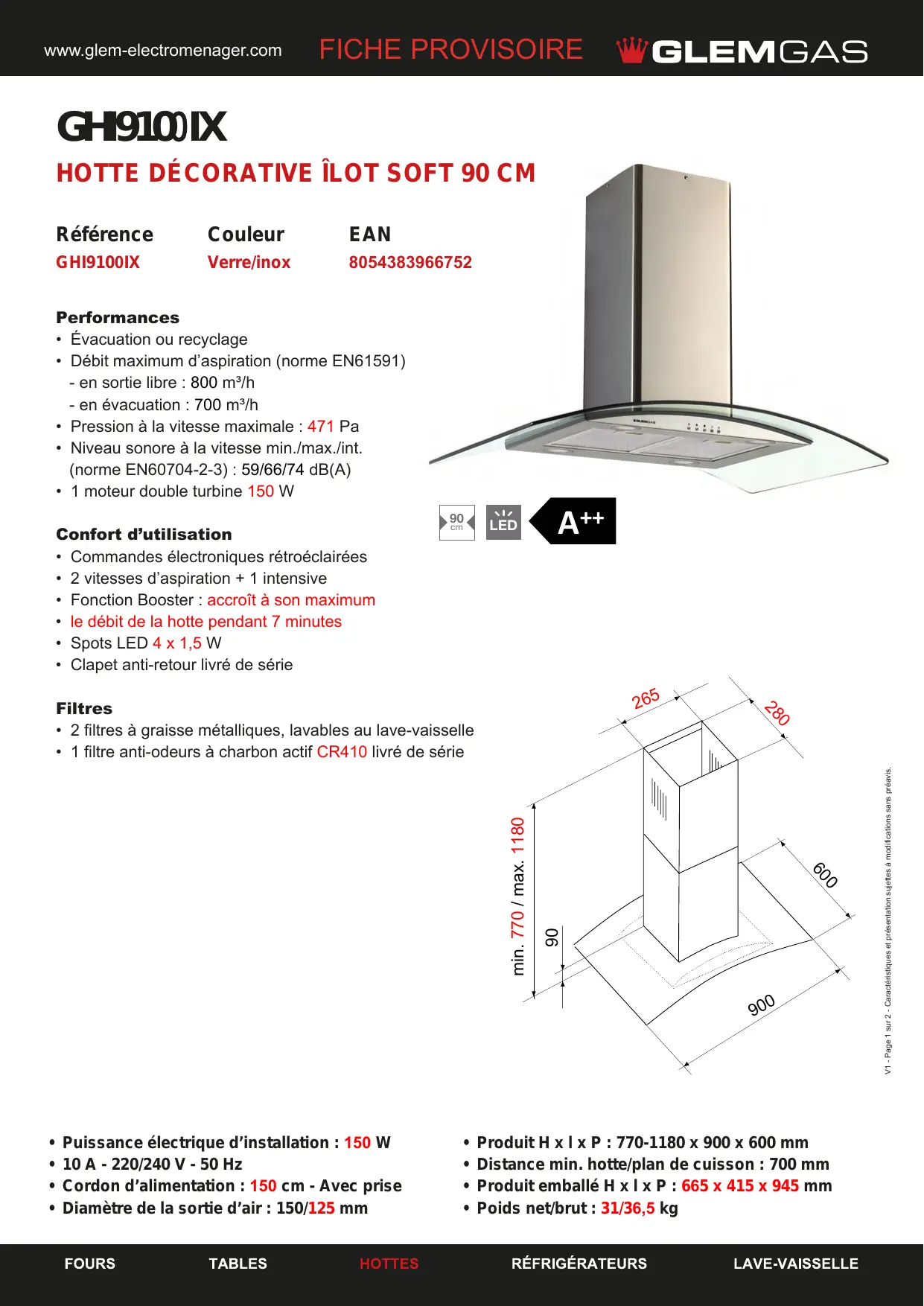 Produit H x l x P : 770-1180 x 900 x 600 mm Distance min. hotte/plan de cuisson : 700 mm Produit emballé H x l x P : 665 x 415 x 945 mm Poids net/brut : 31/36,5 kg