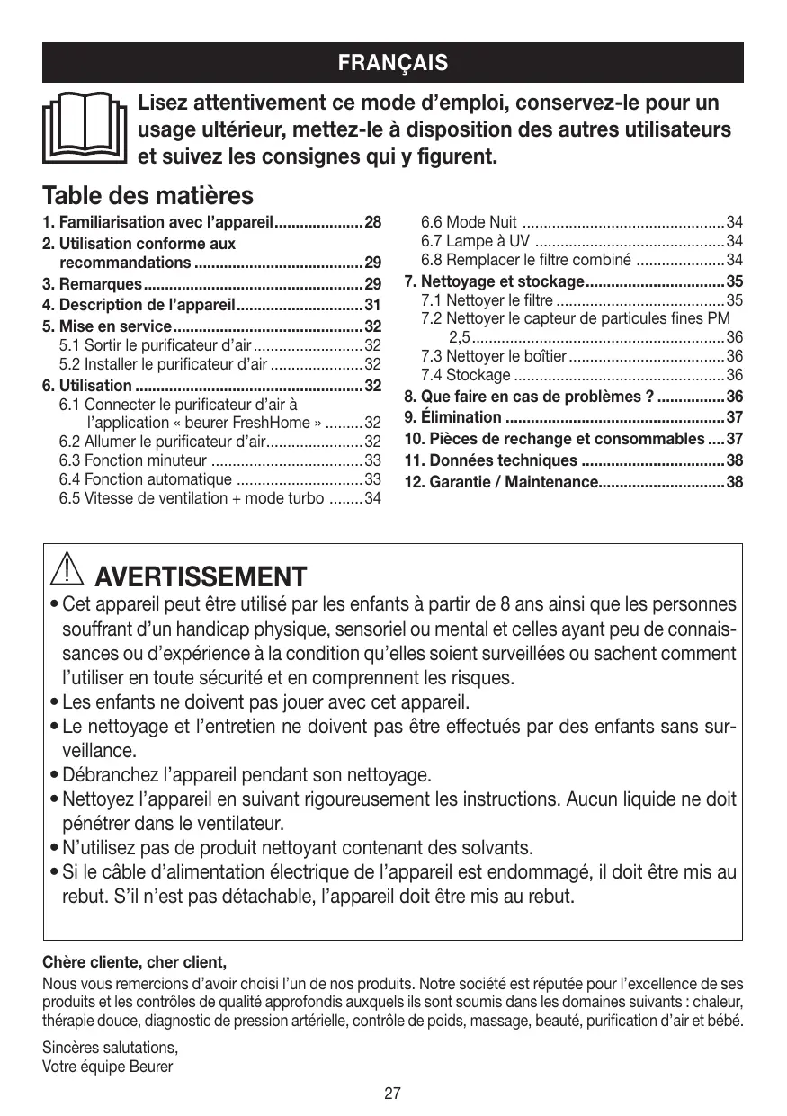 - Si le câble d’alimentation électrique de l’appareil est endommagé, il doit être mis au rebut. S’il n’est pas détachable, l’appareil doit être mis au rebut. Chère cliente, cher client, Nous vous remercions d’avoir choisi l’un de nos produits. Notre société est réputée pour l’excellence de ses produits et les contrôles de qualité approfondis auxquels ils sont soumis dans les domaines suivants : chaleur, thérapie douce, diagnostic de pression artérielle, contrôle de poids, massage, beauté, purification d’air et bébé. Sincères salutations, Votre équipe Beurer