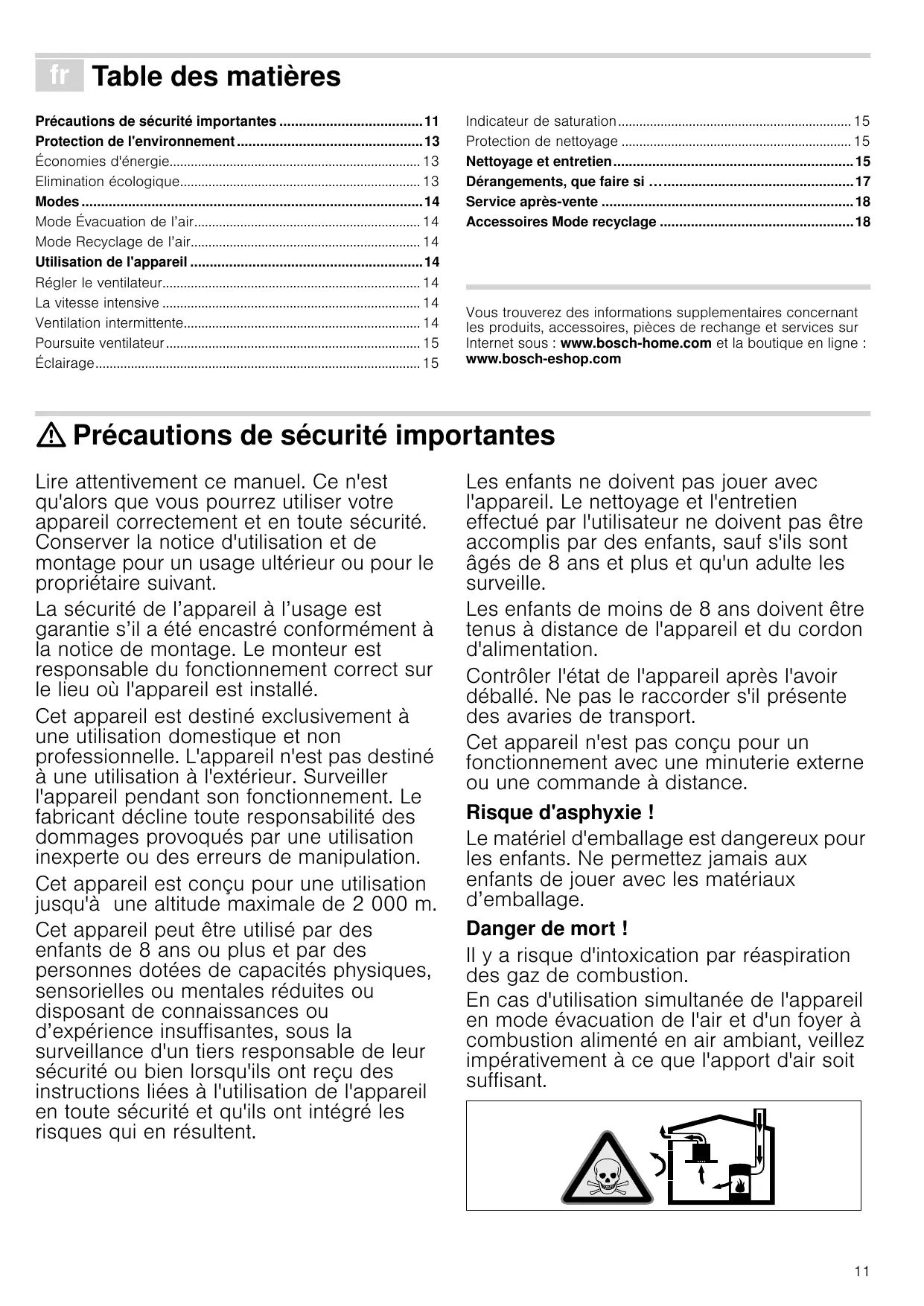 Les enfants ne doivent pas jouer avec l'appareil. Le nettoyage et l'entretien effectué par l'utilisateur ne doivent pas être accomplis par des enfants, sauf s'ils sont âgés de 8 ans et plus et qu'un adulte les surveille. Les enfants de moins de 8 ans doivent être tenus à distance de l'appareil et du cordon d'alimentation. Contrôler l'état de l'appareil après l'avoir déballé. Ne pas le raccorder s'il présente des avaries de transport. Cet appareil n'est pas conçu pour un fonctionnement avec une minuterie externe ou une commande à distance. Risque d'asphyxie ! Le matériel d'emballage est dangereux pour les enfants. Ne permettez jamais aux enfants de jouer avec les matériaux d’emballage. Danger de mort ! Il y a risque d'intoxication par réaspiration des gaz de combustion. En cas d'utilisation simultanée de l'appareil en mode évacuation de l'air et d'un foyer à combustion alimenté en air ambiant, veillez impérativement à ce que l'apport d'air soit suffisant.