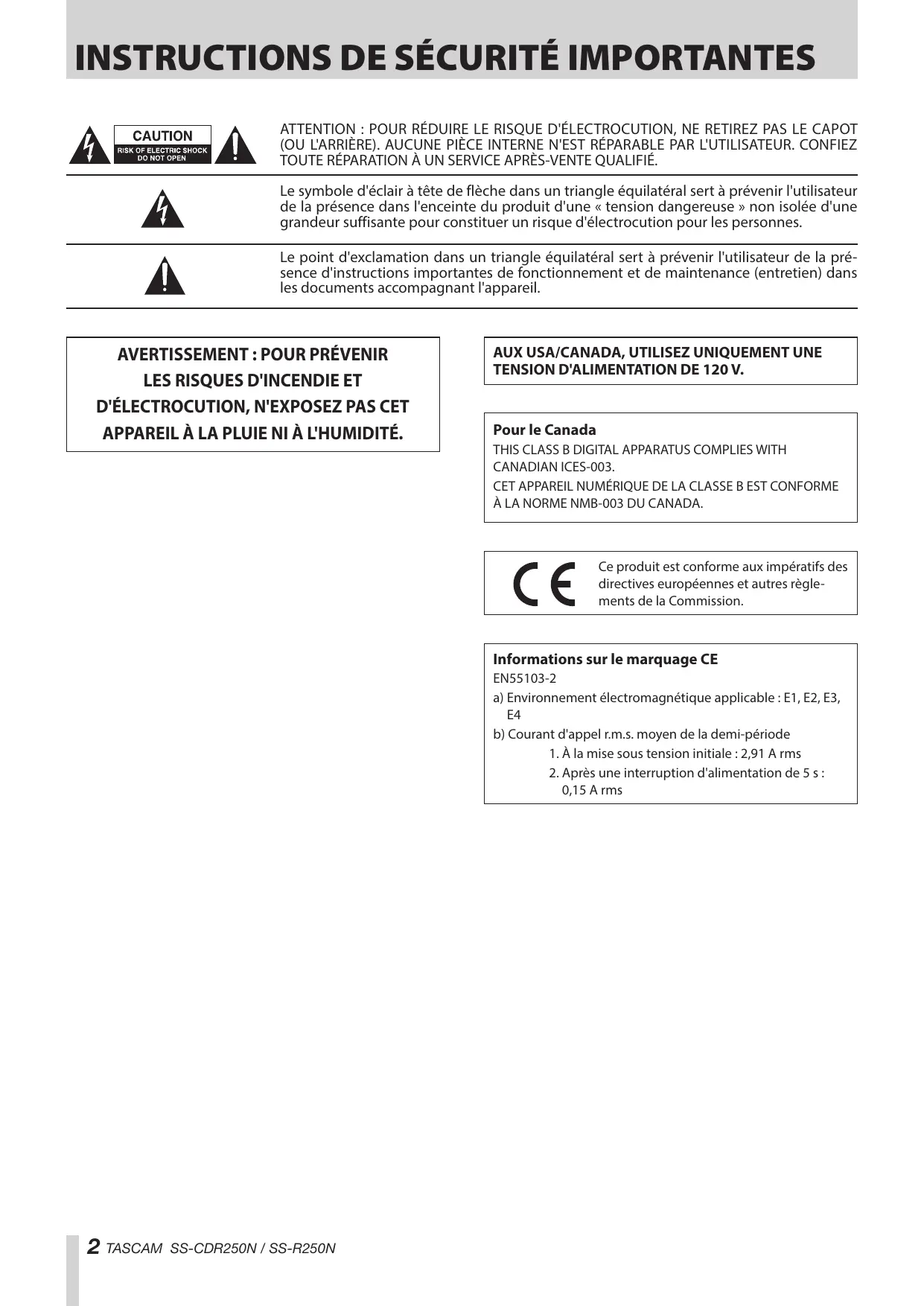 2 TASCAM SS-CDR250N / SS-R250N INSTRUCTIONS DE SÉCURITÉ IMPORTANTES 1. Lisez ces instructions. 2. Conservez ces instructions. 3. Tenez compte de tous les avertissements. 4. Suivez toutes les instructions. 5. N'utilisez pas cet appareil avec de l'eau à proximité. 6. Ne nettoyez l'appareil qu'avec un chiffon sec. 7. Ne bloquez aucune ouverture de ventilation. Installez-le conformément aux instructions du fabricant.