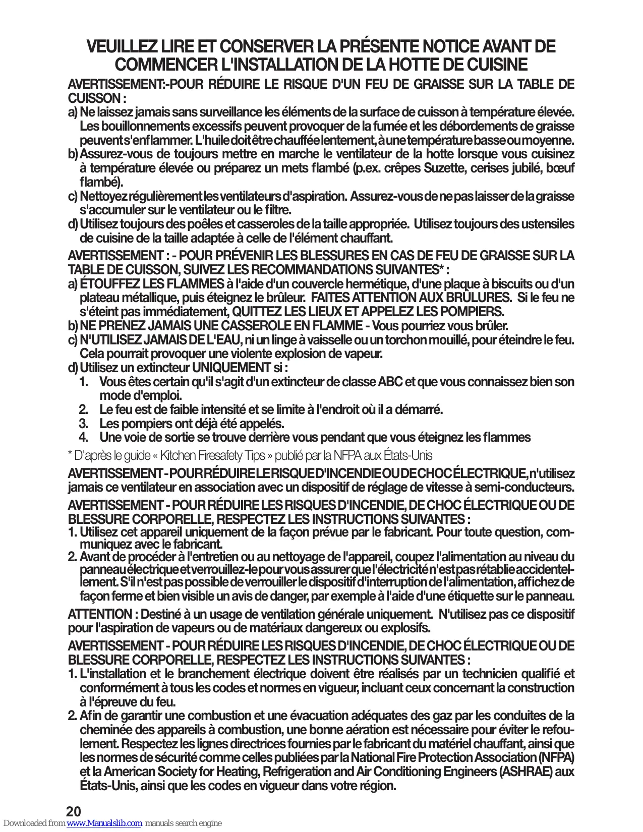 - D'après le guide « Kitchen Firesafety Tips » publié par la NFPA aux États-Unis AVERTISSEMENT-POURRÉDUIRELERISQUED'INCENDIEOUDECHOCÉLECTRIQUE,n'utilisez jamais ce ventilateur en association avec un dispositif de réglage de vitesse à semi-conducteurs. AVERTISSEMENT - POUR RÉDUIRE LES RISQUES D'INCENDIE, DE CHOC ÉLECTRIQUE OU DE BLESSURE CORPORELLE, RESPECTEZ LES INSTRUCTIONS SUIVANTES : 1. Utilisez cet appareil uniquement de la façon prévue par le fabricant. Pour toute question, communiquez avec le fabricant.