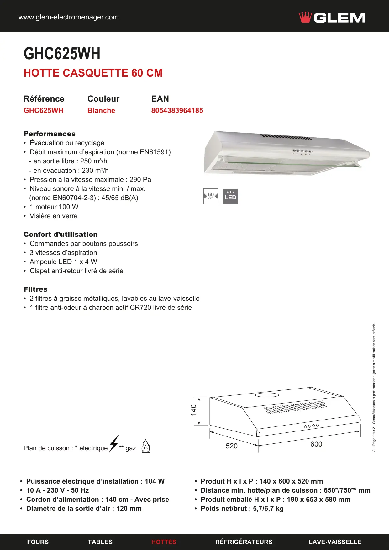 Produit H x l x P : 140 x 600 x 520 mm Distance min. hotte/plan de cuisson : 650*/750** mm Produit emballé H x l x P : 190 x 653 x 580 mm Poids net/brut : 5,7/6,7 kg