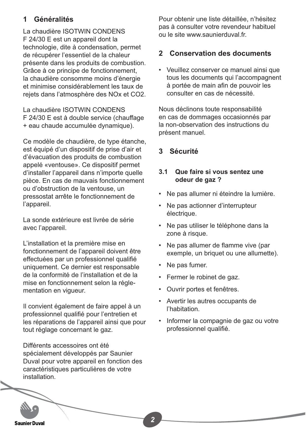 Les appareils Saunier Duval sont fabriqués conformément aux dernières évolutions techniques et aux règles de sécurité en vigueur. La chaudière ISOTWIN CONDENS est spécialement destinée à la production d’eau chaude en utilisant l’énergie du gaz. Toute autre utilisation est considérée comme inadéquate et interdite. Le fabricant ne sera en aucun cas tenu responsable des dommages ou dégâts résultant d’une utilisation étrangère à l’objet auquel est destiné l’appareil. Tout risque est supporté intégralement par l’utilisateur. La notion d’utilisation prévue englobe également le respect des instructions de la notice d’emploi, du manuel d’installation et de tous les documents d’accompagnement ainsi que le respect des conditions d’installation et d’entretien.