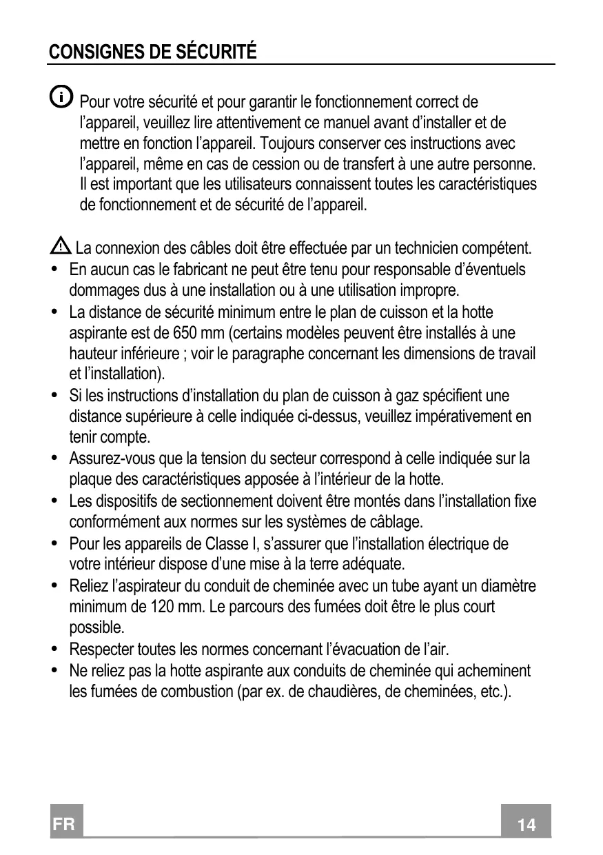 - La distance de sécurité minimum entre le plan de cuisson et la hotte aspirante est de 650 mm (certains modèles peuvent être installés à une hauteur inférieure ; voir le paragraphe concernant les dimensions de travail et l’installation).