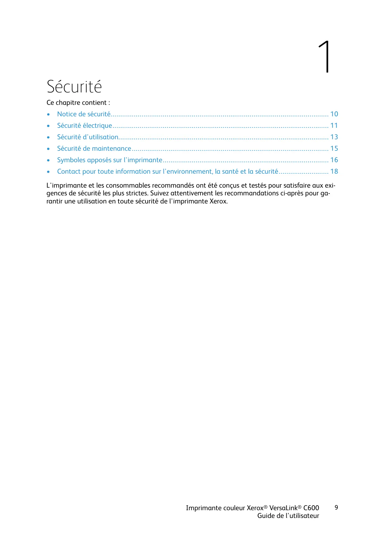 Contact pour toute information sur l'environnement, la santé et la sécurité.......................... 18 L'imprimante et les consommables recommandés ont été conçus et testés pour satisfaire aux exigences de sécurité les plus strictes. Suivez attentivement les recommandations ci-après pour garantir une utilisation en toute sécurité de l'imprimante Xerox. Imprimante couleur Xerox® VersaLink® C600 Guide de l'utilisateur