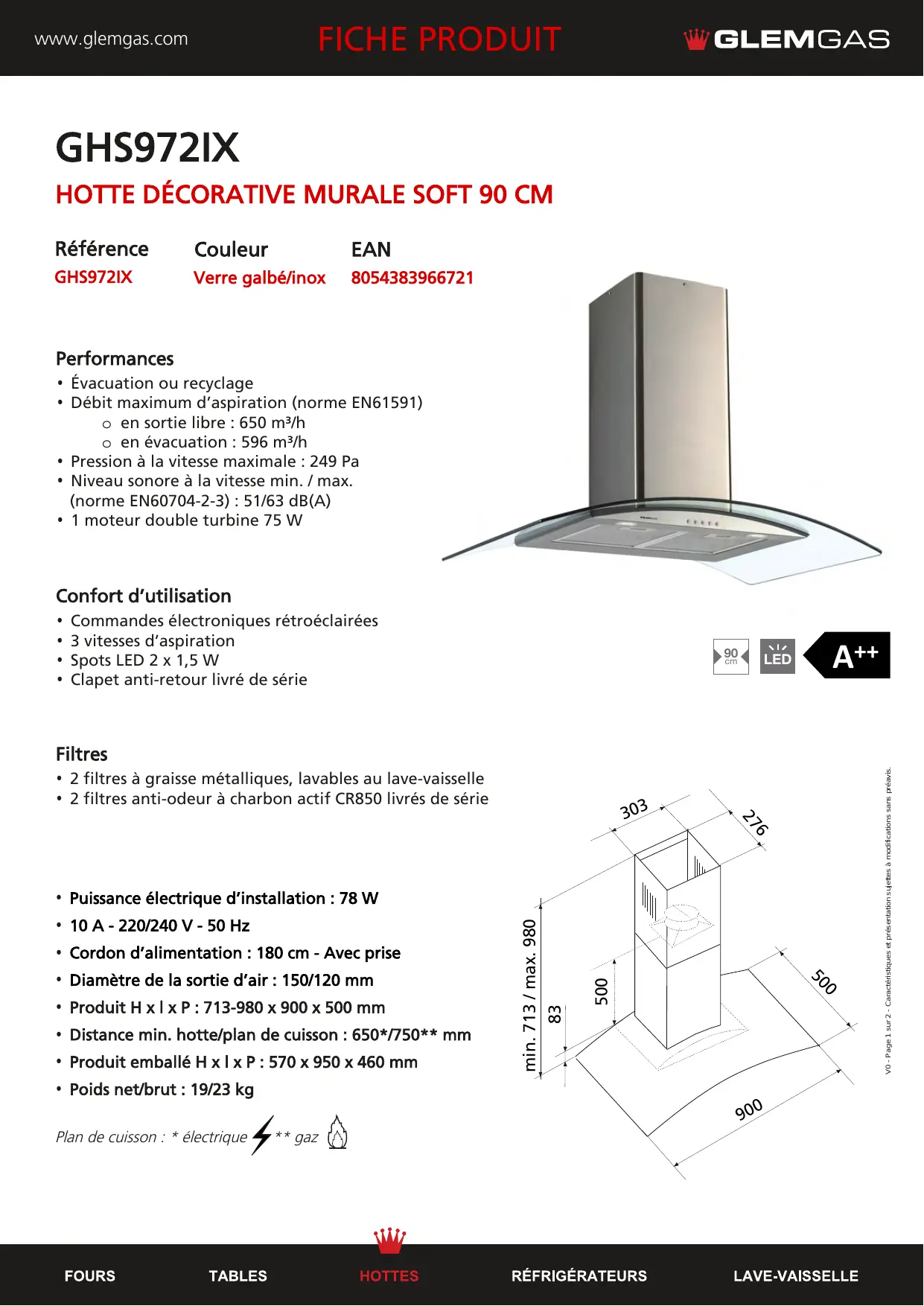Référence Couleur EAN GHS972IX Verre galbé/inox 8054383966721 Performances + Évacuation ou recyclage + Débit maximum d'aspiration (norme EN61591) o en sortie libre : 650 m3/h o en évacuation : 596 m*/h