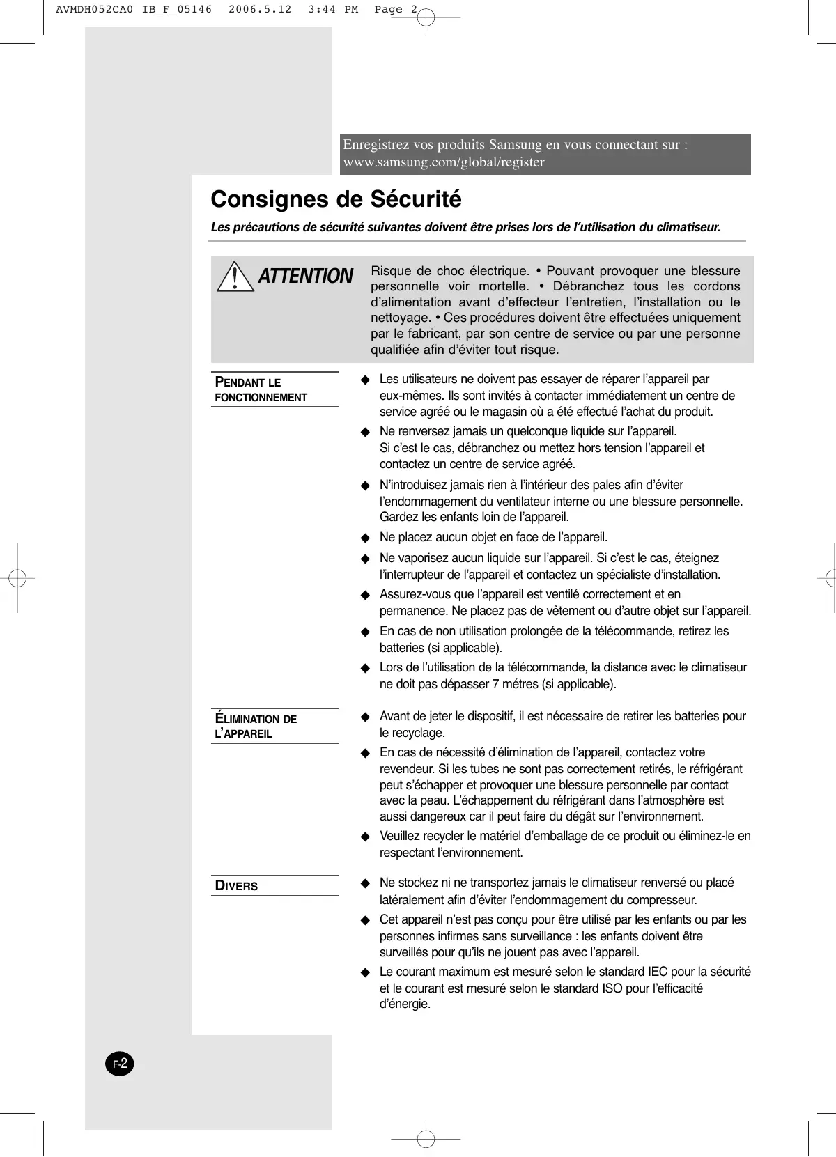 3:44 PM Page 2 Enregistrez vos produits Samsung en vous connectant sur : www.samsung.com/global/register Consignes de Sécurité Les précautions de sécurité suivantes doivent être prises lors de l’utilisation du climatiseur. ATTENTION PENDANT LE FONCTIONNEMENT Risque de choc électrique. • Pouvant provoquer une blessure personnelle voir mortelle. • Débranchez tous les cordons d’alimentation avant d’effecteur l’entretien, l’installation ou le nettoyage. • Ces procédures doivent être effectuées uniquement par le fabricant, par son centre de service ou par une personne qualifiée afin d’éviter tout risque. ◆ Les utilisateurs ne doivent pas essayer de réparer l’appareil par eux-mêmes. Ils sont invités à contacter immédiatement un centre de service agréé ou le magasin où a été effectué l’achat du produit. ◆ Ne renversez jamais un quelconque liquide sur l’appareil. Si c’est le cas, débranchez ou mettez hors tension l’appareil et contactez un centre de service agréé. ◆ N’introduisez jamais rien à l’intérieur des pales afin d’éviter l’endommagement du ventilateur interne ou une blessure personnelle. Gardez les enfants loin de l’appareil. ◆ Ne placez aucun objet en face de l’appareil. ◆ Ne vaporisez aucun liquide sur l’appareil. Si c’est le cas, éteignez l’interrupteur de l’appareil et contactez un spécialiste d’installation. ◆ Assurez-vous que l’appareil est ventilé correctement et en permanence. Ne placez pas de vêtement ou d’autre objet sur l’appareil. ◆ En cas de non utilisation prolongée de la télécommande, retirez les batteries (si applicable). ◆ Lors de l’utilisation de la télécommande, la distance avec le climatiseur ne doit pas dépasser 7 métres (si applicable). ÉLIMINATION DE L’APPAREIL ◆ Avant de jeter le dispositif, il est nécessaire de retirer les batteries pour le recyclage. ◆ En cas de nécessité d’élimination de l’appareil, contactez votre revendeur. Si les tubes ne sont pas correctement retirés, le réfrigérant peut s’échapper et provoquer une blessure personnelle par contact avec la peau. L’échappement du réfrigérant dans l’atmosphère est aussi dangereux car il peut faire du dégât sur l’environnement. ◆ Veuillez recycler le matériel d’emballage de ce produit ou éliminez-le en respectant l’environnement. DIVERS ◆ Ne stockez ni ne transportez jamais le climatiseur renversé ou placé latéralement afin d’éviter l’endommagement du compresseur. ◆ Cet appareil n’est pas conçu pour être utilisé par les enfants ou par les personnes infirmes sans surveillance : les enfants doivent être surveillés pour qu’ils ne jouent pas avec l’appareil. ◆ Le courant maximum est mesuré selon le standard IEC pour la sécurité et le courant est mesuré selon le standard ISO pour l’efficacité d’énergie. F-2
