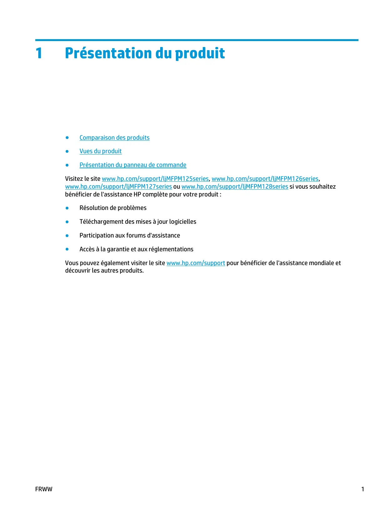 Visitez le site www.hp.com/support/ljMFPM125series, www.hp.com/support/ljMFPM126series, www.hp.com/support/ljMFPM127series ou www.hp.com/support/ljMFPM128series si vous souhaitez bénéficier de l'assistance HP complète pour votre produit : ●