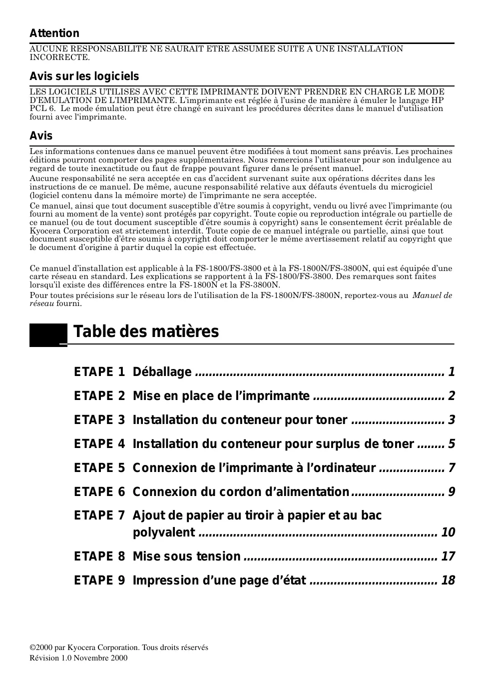 - FS-1800/N FS-3800/N Page Printers Page imprimante Manuel d’installation Installation Manual Attention AUCUNE RESPONSABILITE NE SAURAIT ETRE ASSUMEE SUITE A UNE INSTALLATION INCORRECTE. Avis sur les logiciels LES LOGICIELS UTILISES AVEC CETTE IMPRIMANTE DOIVENT PRENDRE EN CHARGE LE MODE D’EMULATION DE L’IMPRIMANTE. L’imprimante est réglée à l’usine de manière à émuler le langage HP PCL 6. Le mode émulation peut être changé en suivant les procédures décrites dans le manuel d'utilisation fourni avec l'imprimante. Avis Les informations contenues dans ce manuel peuvent être modifiées à tout moment sans préavis. Les prochaines éditions pourront comporter des pages supplémentaires. Nous remercions l’utilisateur pour son indulgence au regard de toute inexactitude ou faut de frappe pouvant figurer dans le présent manuel. Aucune responsabilité ne sera acceptée en cas d’accident survenant suite aux opérations décrites dans les instructions de ce manuel. De même, aucune responsabilité relative aux défauts éventuels du microgiciel (logiciel contenu dans la mémoire morte) de l’imprimante ne sera acceptée. Ce manuel, ainsi que tout document susceptible d’être soumis à copyright, vendu ou livré avec l’imprimante (ou fourni au moment de la vente) sont protégés par copyright. Toute copie ou reproduction intégrale ou partielle de ce manuel (ou de tout document susceptible d’être soumis à copyright) sans le consentement écrit préalable de Kyocera Corporation est strictement interdit. Toute copie de ce manuel intégrale ou partielle, ainsi que tout document susceptible d’être soumis à copyright doit comporter le même avertissement relatif au copyright que le document d’origine à partir duquel la copie est effectuée. Ce manuel d’installation est applicable à la FS-1800/FS-3800 et à la FS-1800N/FS-3800N, qui est équipée d’une carte réseau en standard. Les explications se rapportent à la FS-1800/FS-3800. Des remarques sont faites lorsqu’il existe des différences entre la FS-1800N et la FS-3800N. Pour toutes précisions sur le réseau lors de l’utilisation de la FS-1800N/FS-3800N, reportez-vous au Manuel de réseau fourni. Table des matières ETAPE 1 Déballage p. 1