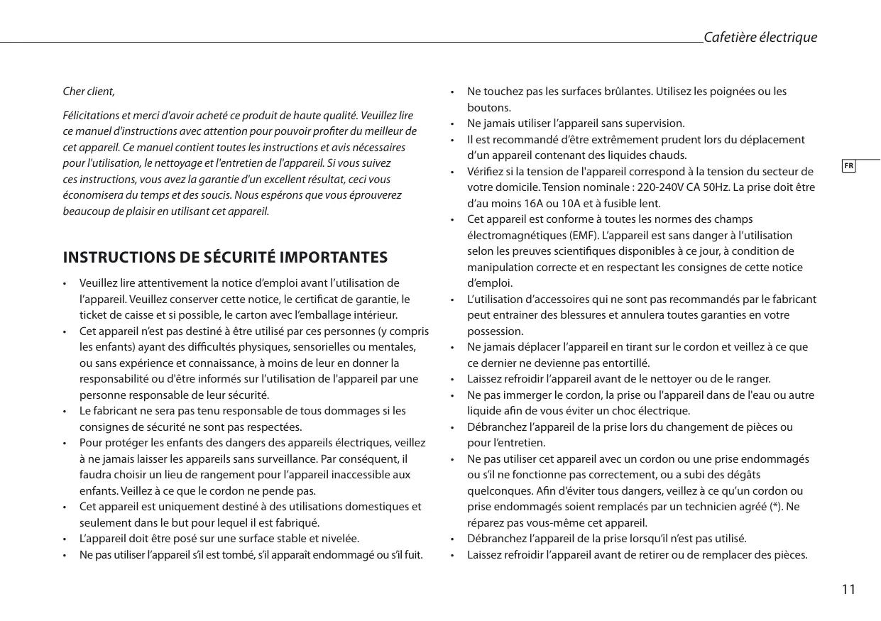 Ne jamais utiliser l’appareil sans supervision. Il est recommandé d’être extrêmement prudent lors du déplacement d’un appareil contenant des liquides chauds. Vérifiez si la tension de l'appareil correspond à la tension du secteur de votre domicile. Tension nominale : 220-240V CA 50Hz. La prise doit être d’au moins 16A ou 10A et à fusible lent. Cet appareil est conforme à toutes les normes des champs électromagnétiques (EMF). L’appareil est sans danger à l’utilisation selon les preuves scientifiques disponibles à ce jour, à condition de manipulation correcte et en respectant les consignes de cette notice d’emploi. L’utilisation d’accessoires qui ne sont pas recommandés par le fabricant peut entrainer des blessures et annulera toutes garanties en votre possession. Ne jamais déplacer l’appareil en tirant sur le cordon et veillez à ce que ce dernier ne devienne pas entortillé. Laissez refroidir l’appareil avant de le nettoyer ou de le ranger. Ne pas immerger le cordon, la prise ou l'appareil dans de l'eau ou autre liquide afin de vous éviter un choc électrique. Débranchez l’appareil de la prise lors du changement de pièces ou pour l’entretien. Ne pas utiliser cet appareil avec un cordon ou une prise endommagés ou s’il ne fonctionne pas correctement, ou a subi des dégâts quelconques. Afin d’éviter tous dangers, veillez à ce qu’un cordon ou prise endommagés soient remplacés par un technicien agréé (*). Ne réparez pas vous-même cet appareil. Débranchez l’appareil de la prise lorsqu’il n’est pas utilisé. Laissez refroidir l’appareil avant de retirer ou de remplacer des pièces.