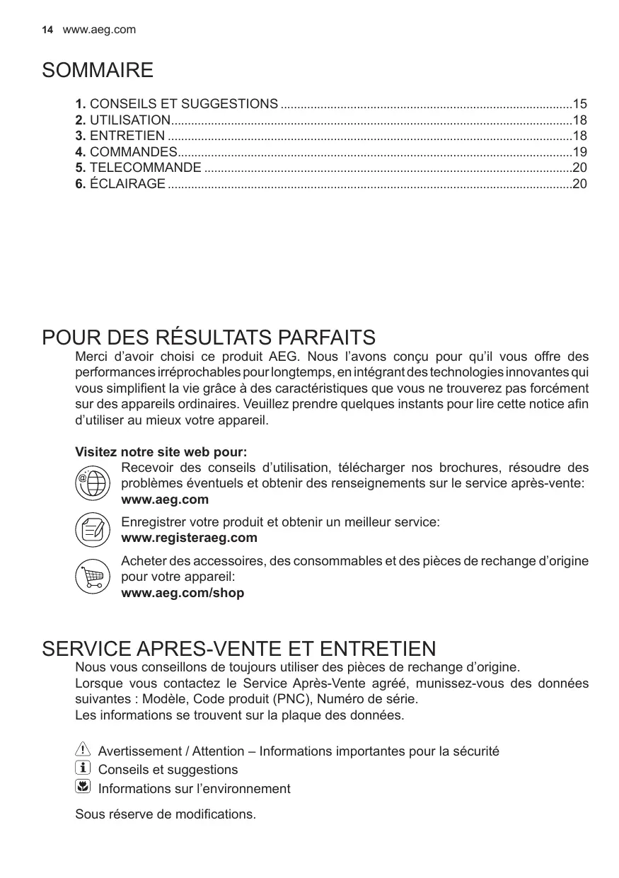 FR Manuel de l’utilisateur Hotte de Cuisine Merci d’avoir choisi ce produit AEG. Nous l’avons conçu pour qu’il vous offre des performances irréprochables pour longtemps, en intégrant des technologies innovantes qui vous simplifient la vie grâce à des caractéristiques que vous ne trouverez pas forcément sur des appareils ordinaires. Veuillez prendre quelques instants pour lire cette notice afin d’utiliser au mieux votre appareil. Visitez notre site web pour: Recevoir des conseils d’utilisation, télécharger nos brochures, résoudre des problèmes éventuels et obtenir des renseignements sur le service après-vente: www.aeg.com Enregistrer votre produit et obtenir un meilleur service: www.registeraeg.com Acheter des accessoires, des consommables et des pièces de rechange d’origine pour votre appareil: www.aeg.com/shop Nous vous conseillons de toujours utiliser des pièces de rechange d’origine. Lorsque vous contactez le Service Après-Vente agréé, munissez-vous des données suivantes : Modèle, Code produit (PNC), Numéro de série. Les informations se trouvent sur la plaque des données. Avertissement / Attention – Informations importantes pour la sécurité Conseils et suggestions Informations sur l’environnement Sous réserve de modifications. FRENCH 15