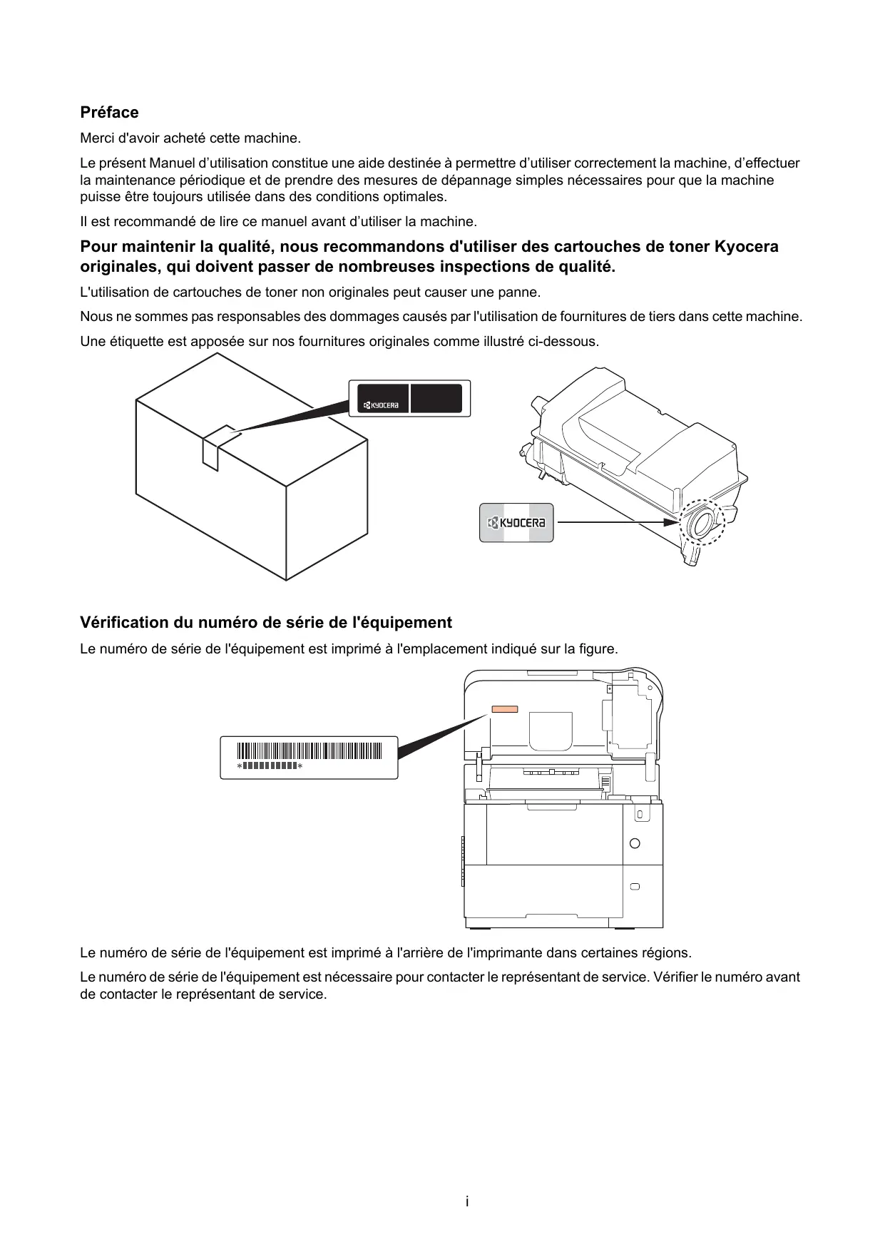 Préface Merci d'avoir acheté cette machine. Le présent Manuel d’utilisation constitue une aide destinée à permettre d’utiliser correctement la machine, d’effectuer la maintenance périodique et de prendre des mesures de dépannage simples nécessaires pour que la machine puisse être toujours utilisée dans des conditions optimales. Il est recommandé de lire ce manuel avant d’utiliser la machine. Pour maintenir la qualité, nous recommandons d'utiliser des cartouches de toner Kyocera originales, qui doivent passer de nombreuses inspections de qualité. L'utilisation de cartouches de toner non originales peut causer une panne. Nous ne sommes pas responsables des dommages causés par l'utilisation de fournitures de tiers dans cette machine. Une étiquette est apposée sur nos fournitures originales comme illustré ci-dessous. Vérification du numéro de série de l'équipement Le numéro de série de l'équipement est imprimé à l'emplacement indiqué sur la figure. Le numéro de série de l'équipement est imprimé à l'arrière de l'imprimante dans certaines régions. Le numéro de série de l'équipement est nécessaire pour contacter le représentant de service. Vérifier le numéro avant de contacter le représentant de service.