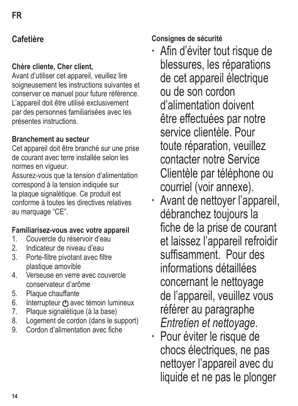 Cafetière Chère cliente, Cher client, Avant d’utiliser cet appareil, veuillez lire soigneusement les instructions suivantes et conserver ce manuel pour future référence. L’appareil doit être utilisé exclusivement par des personnes familiarisées avec les présentes instructions. Branchement au secteur Cet appareil doit être branché sur une prise de courant avec terre installée selon les normes en vigueur. Assurez-vous que la tension d’alimentation correspond à la tension indiquée sur la plaque signalétique. Ce produit est conforme à toutes les directives relatives au marquage “CE”. Familiarisez-vous avec votre appareil