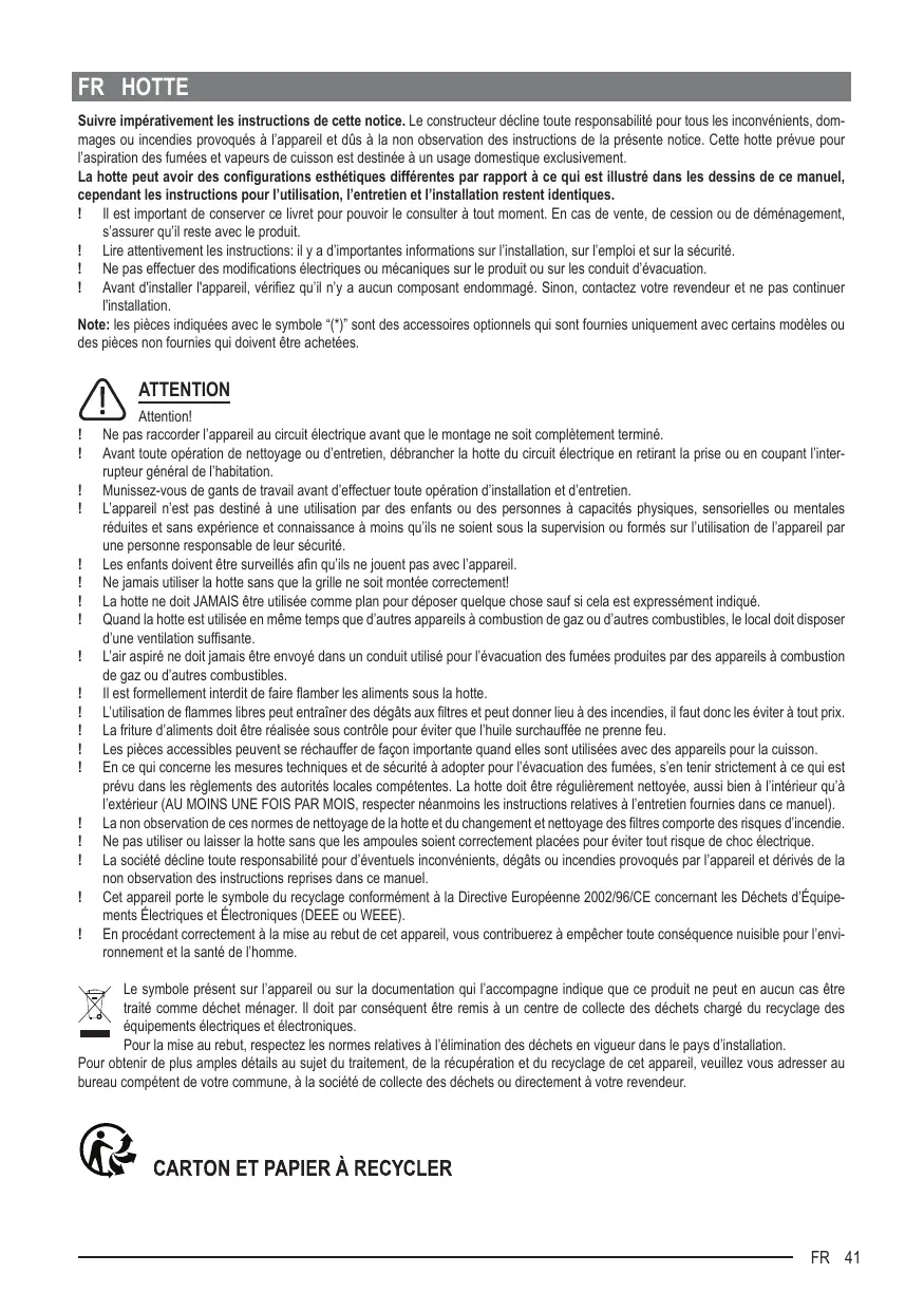 Ne pas raccorder l’appareil au circuit électrique avant que le montage ne soit complètement terminé. Avant toute opération de nettoyage ou d’entretien, débrancher la hotte du circuit électrique en retirant la prise ou en coupant l’interrupteur général de l’habitation. Munissez-vous de gants de travail avant d’effectuer toute opération d’installation et d’entretien. L’appareil n’est pas destiné à une utilisation par des enfants ou des personnes à capacités physiques, sensorielles ou mentales réduites et sans expérience et connaissance à moins qu’ils ne soient sous la supervision ou formés sur l’utilisation de l’appareil par une personne responsable de leur sécurité. Les enfants doivent être surveillés afin qu’ils ne jouent pas avec l’appareil. Ne jamais utiliser la hotte sans que la grille ne soit montée correctement! La hotte ne doit JAMAIS être utilisée comme plan pour déposer quelque chose sauf si cela est expressément indiqué. Quand la hotte est utilisée en même temps que d’autres appareils à combustion de gaz ou d’autres combustibles, le local doit disposer d’une ventilation suffisante. L’air aspiré ne doit jamais être envoyé dans un conduit utilisé pour l’évacuation des fumées produites par des appareils à combustion de gaz ou d’autres combustibles. Il est formellement interdit de faire flamber les aliments sous la hotte. L’utilisation de flammes libres peut entraîner des dégâts aux filtres et peut donner lieu à des incendies, il faut donc les éviter à tout prix. La friture d’aliments doit être réalisée sous contrôle pour éviter que l’huile surchauffée ne prenne feu. Les pièces accessibles peuvent se réchauffer de façon importante quand elles sont utilisées avec des appareils pour la cuisson. En ce qui concerne les mesures techniques et de sécurité à adopter pour l’évacuation des fumées, s’en tenir strictement à ce qui est prévu dans les règlements des autorités locales compétentes. La hotte doit être régulièrement nettoyée, aussi bien à l’intérieur qu’à l’extérieur (AU MOINS UNE FOIS PAR MOIS, respecter néanmoins les instructions relatives à l’entretien fournies dans ce manuel). La non observation de ces normes de nettoyage de la hotte et du changement et nettoyage des filtres comporte des risques d’incendie. Ne pas utiliser ou laisser la hotte sans que les ampoules soient correctement placées pour éviter tout risque de choc électrique. La société décline toute responsabilité pour d’éventuels inconvénients, dégâts ou incendies provoqués par l’appareil et dérivés de la non observation des instructions reprises dans ce manuel. Cet appareil porte le symbole du recyclage conformément à la Directive Européenne 2002/96/CE concernant les Déchets d’Équipements Électriques et Électroniques (DEEE ou WEEE). En procédant correctement à la mise au rebut de cet appareil, vous contribuerez à empêcher toute conséquence nuisible pour l’environnement et la santé de l’homme.