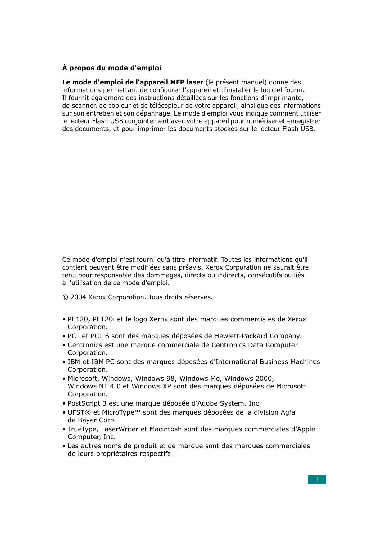 Ce mode d'emploi n'est fourni qu'à titre informatif. Toutes les informations qu'il contient peuvent être modifiées sans préavis. Xerox Corporation ne saurait être tenu pour responsable des dommages, directs ou indirects, consécutifs ou liés à l'utilisation de ce mode d'emploi. © 2004 Xerox Corporation. Tous droits réservés. • PE120, PE120i et le logo Xerox sont des marques commerciales de Xerox Corporation. • PCL et PCL 6 sont des marques déposées de Hewlett-Packard Company. • Centronics est une marque commerciale de Centronics Data Computer Corporation. • IBM et IBM PC sont des marques déposées d'International Business Machines Corporation. • Microsoft, Windows, Windows 98, Windows Me, Windows 2000, Windows NT 4.0 et Windows XP sont des marques déposées de Microsoft Corporation. • PostScript 3 est une marque déposée d'Adobe System, Inc. • UFST® et MicroType™ sont des marques déposées de la division Agfa de Bayer Corp. • TrueType, LaserWriter et Macintosh sont des marques commerciales d'Apple Computer, Inc. • Les autres noms de produit et de marque sont des marques commerciales de leurs propriétaires respectifs.