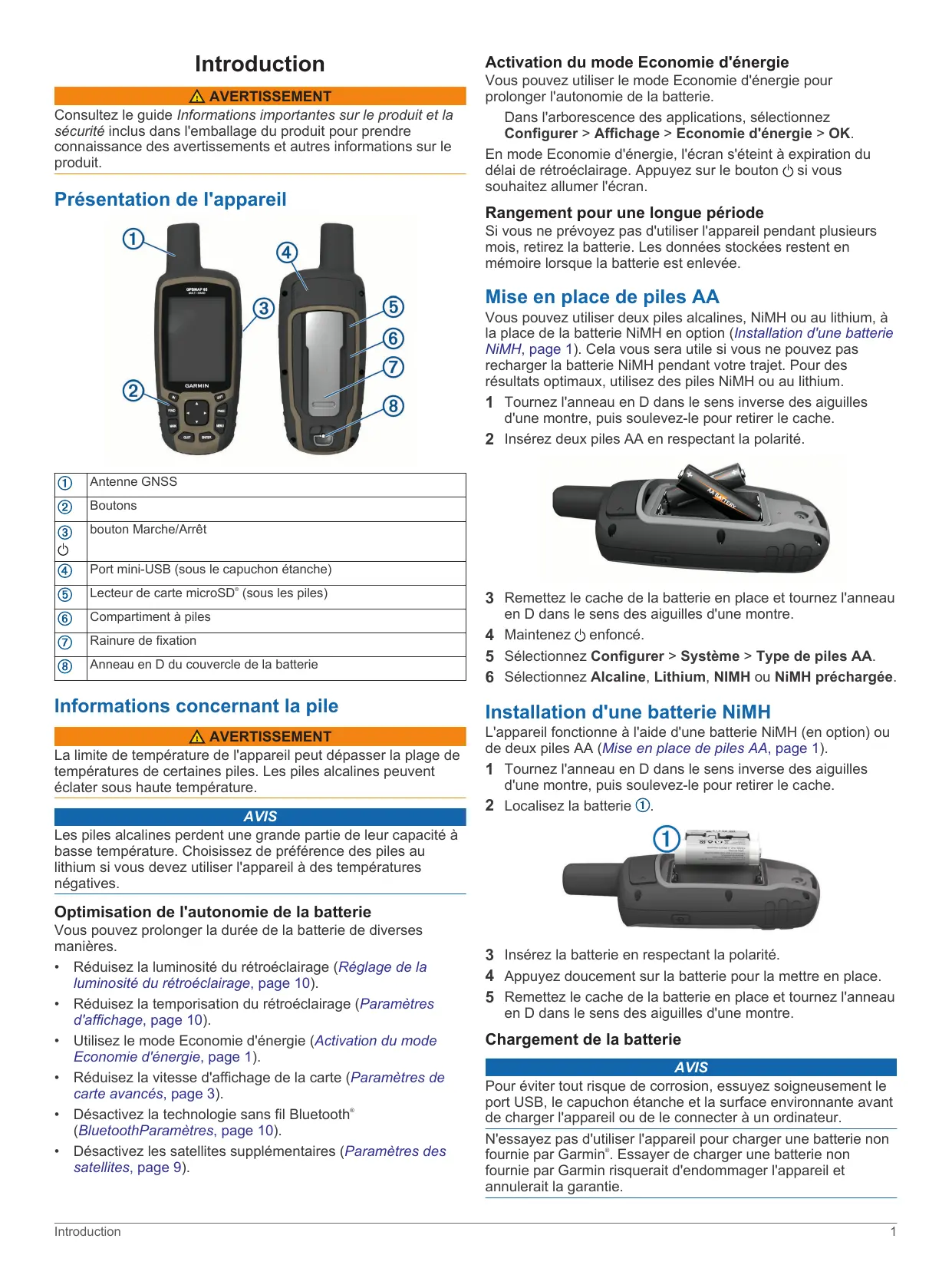 Table des matières Introduction Activation du mode Economie d'énergie AVERTISSEMENT Consultez le guide Informations importantes sur le produit et la sécurité inclus dans l'emballage du produit pour prendre connaissance des avertissements et autres informations sur le produit. Présentation de l'appareil Vous pouvez utiliser le mode Economie d'énergie pour prolonger l'autonomie de la batterie. Dans l'arborescence des applications, sélectionnez Configurer > Affichage > Economie d'énergie > OK. En mode Economie d'énergie, l'écran s'éteint à expiration du délai de rétroéclairage. Appuyez sur le bouton si vous souhaitez allumer l'écran. Rangement pour une longue période Si vous ne prévoyez pas d'utiliser l'appareil pendant plusieurs mois, retirez la batterie. Les données stockées restent en mémoire lorsque la batterie est enlevée. Mise en place de piles AA Vous pouvez utiliser deux piles alcalines, NiMH ou au lithium, à la place de la batterie NiMH en option (Installation d'une batterie NiMH, page 1). Cela vous sera utile si vous ne pouvez pas recharger la batterie NiMH pendant votre trajet. Pour des résultats optimaux, utilisez des piles NiMH ou au lithium. 1 Tournez l'anneau en D dans le sens inverse des aiguilles d'une montre, puis soulevez-le pour retirer le cache. 2 Insérez deux piles AA en respectant la polarité. Antenne GNSS Boutons bouton Marche/Arrêt Port mini-USB (sous le capuchon étanche) Lecteur de carte microSD (sous les piles)