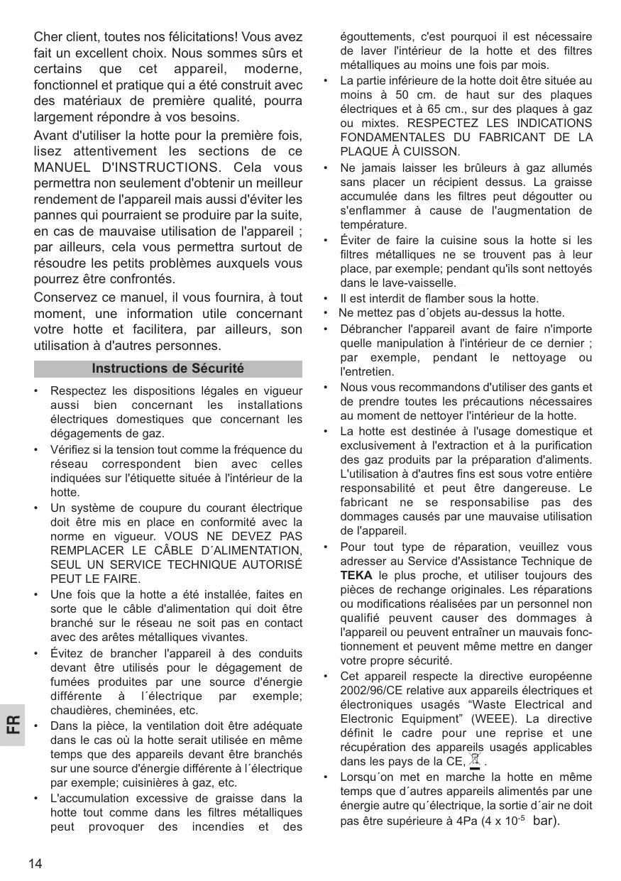 La partie inférieure de la hotte doit être située au moins à 50 cm. de haut sur des plaques électriques et à 65 cm., sur des plaques à gaz ou mixtes. RESPECTEZ LES INDICATIONS FONDAMENTALES DU FABRICANT DE LA PLAQUE À CUISSON. Ne jamais laisser les brûleurs à gaz allumés sans placer un récipient dessus. La graisse accumulée dans les filtres peut dégoutter ou s'enflammer à cause de l'augmentation de température. Éviter de faire la cuisine sous la hotte si les filtres métalliques ne se trouvent pas à leur place, par exemple; pendant qu'ils sont nettoyés dans le lave-vaisselle. Il est interdit de flamber sous la hotte. Ne mettez pas d´objets au-dessus la hotte. Débrancher l'appareil avant de faire n'importe quelle manipulation à l'intérieur de ce dernier ; par exemple, pendant le nettoyage ou l'entretien. Nous vous recommandons d'utiliser des gants et de prendre toutes les précautions nécessaires au moment de nettoyer l'intérieur de la hotte. La hotte est destinée à l'usage domestique et exclusivement à l'extraction et à la purification des gaz produits par la préparation d'aliments. L'utilisation à d'autres fins est sous votre entière responsabilité et peut être dangereuse. Le fabricant ne se responsabilise pas des dommages causés par une mauvaise utilisation de l'appareil. Pour tout type de réparation, veuillez vous adresser au Service d'Assistance Technique de TEKA le plus proche, et utiliser toujours des pièces de rechange originales. Les réparations ou modifications réalisées par un personnel non qualifié peuvent causer des dommages à l'appareil ou peuvent entraîner un mauvais fonctionnement et peuvent même mettre en danger votre propre sécurité. Cet appareil respecte la directive européenne 2002/96/CE relative aux appareils électriques et électroniques usagés “Waste Electrical and Electronic Equipment” (WEEE). La directive définit le cadre pour une reprise et une récupération des appareils usagés applicables dans les pays de la CE, . Lorsqu´on met en marche la hotte en même temps que d´autres appareils alimentés par une énergie autre qu´électrique, la sortie d´air ne doit pas être supérieure à 4Pa (4 x 10-5 bar).