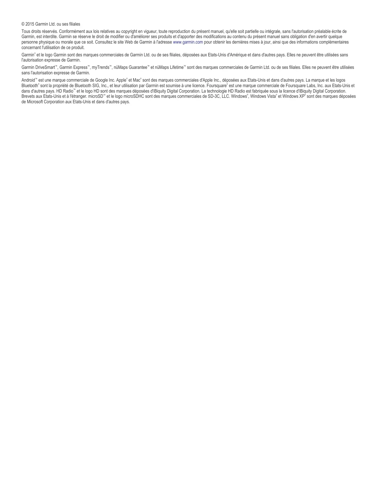 Garmin DriveSmart™, Garmin Express™, myTrends™, nüMaps Guarantee™ et nüMaps Lifetime™ sont des marques commerciales de Garmin Ltd. ou de ses filiales. Elles ne peuvent être utilisées sans l'autorisation expresse de Garmin. Android™ est une marque commerciale de Google Inc. Apple et Mac sont des marques commerciales d'Apple Inc., déposées aux Etats-Unis et dans d'autres pays. La marque et les logos Bluetooth sont la propriété de Bluetooth SIG, Inc., et leur utilisation par Garmin est soumise à une licence. Foursquare est une marque commerciale de Foursquare Labs, Inc. aux Etats-Unis et dans d'autres pays. HD Radio™ et le logo HD sont des marques déposées d'iBiquity Digital Corporation. La technologie HD Radio est fabriquée sous la licence d'iBiquity Digital Corporation. Brevets aux Etats-Unis et à l'étranger. microSD™ et le logo microSDHC sont des marques commerciales de SD-3C, LLC. Windows , Windows Vista et Windows XP sont des marques déposées de Microsoft Corporation aux Etats-Unis et dans d'autres pays.
