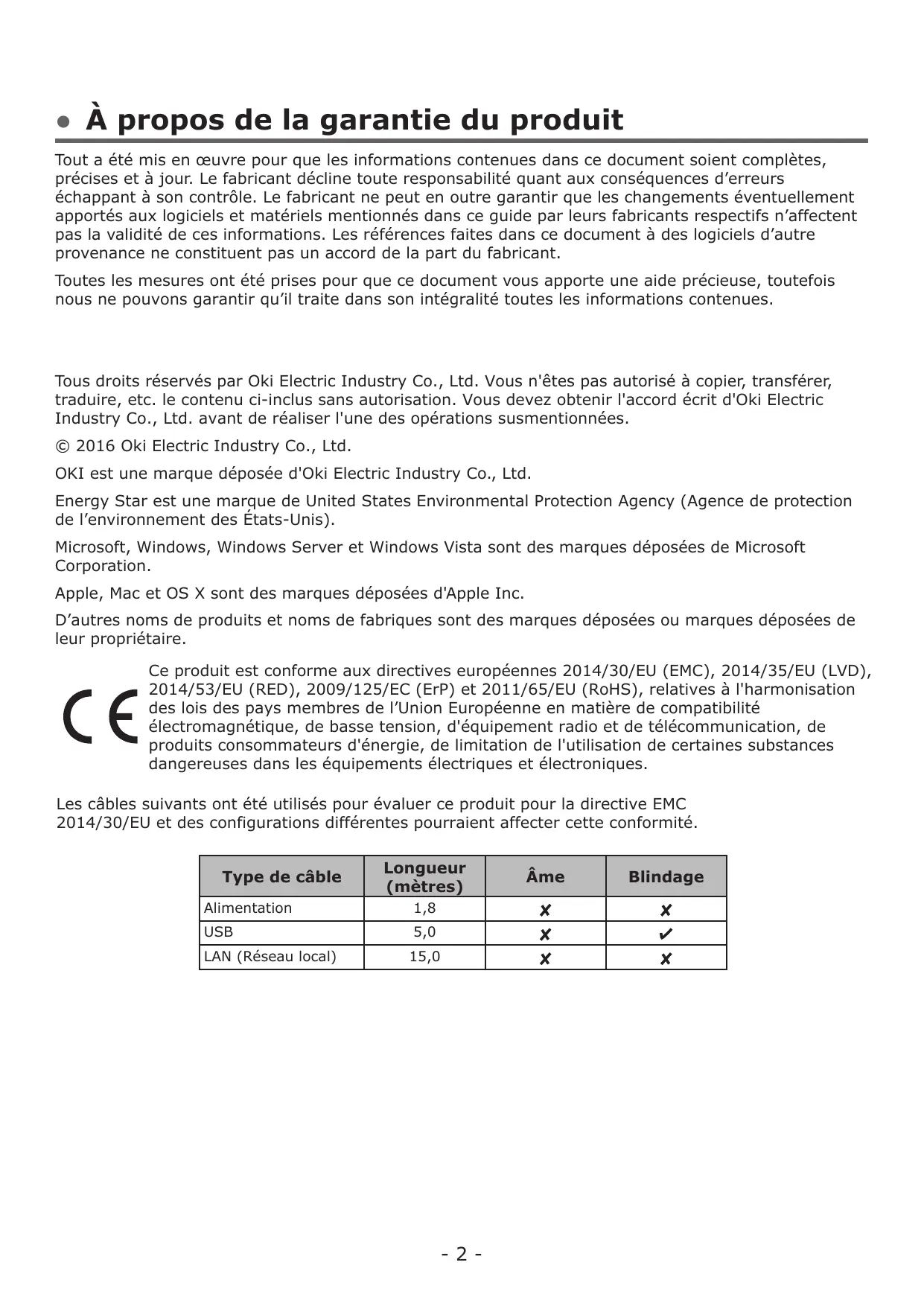 À propos de la garantie du produit Tout a été mis en œuvre pour que les informations contenues dans ce document soient complètes, précises et à jour. Le fabricant décline toute responsabilité quant aux conséquences d’erreurs échappant à son contrôle. Le fabricant ne peut en outre garantir que les changements éventuellement apportés aux logiciels et matériels mentionnés dans ce guide par leurs fabricants respectifs n’affectent pas la validité de ces informations. Les références faites dans ce document à des logiciels d’autre provenance ne constituent pas un accord de la part du fabricant. Toutes les mesures ont été prises pour que ce document vous apporte une aide précieuse, toutefois nous ne pouvons garantir qu’il traite dans son intégralité toutes les informations contenues. Tous droits réservés par Oki Electric Industry Co., Ltd. Vous n'êtes pas autorisé à copier, transférer, traduire, etc. le contenu ci-inclus sans autorisation. Vous devez obtenir l'accord écrit d'Oki Electric Industry Co., Ltd. avant de réaliser l'une des opérations susmentionnées. © 2016 Oki Electric Industry Co., Ltd. OKI est une marque déposée d'Oki Electric Industry Co., Ltd. Energy Star est une marque de United States Environmental Protection Agency (Agence de protection de l’environnement des États-Unis). Microsoft, Windows, Windows Server et Windows Vista sont des marques déposées de Microsoft Corporation. Apple, Mac et OS X sont des marques déposées d'Apple Inc. D’autres noms de produits et noms de fabriques sont des marques déposées ou marques déposées de leur propriétaire. Ce produit est conforme aux directives européennes 2014/30/EU (EMC), 2014/35/EU (LVD), 2014/53/EU (RED), 2009/125/EC (ErP) et 2011/65/EU (RoHS), relatives à l'harmonisation des lois des pays membres de l’Union Européenne en matière de compatibilité électromagnétique, de basse tension, d'équipement radio et de télécommunication, de produits consommateurs d'énergie, de limitation de l'utilisation de certaines substances dangereuses dans les équipements électriques et électroniques. Les câbles suivants ont été utilisés pour évaluer ce produit pour la directive EMC 2014/30/EU et des configurations différentes pourraient affecter cette conformité. Type de câble Alimentation USB LAN (Réseau local) Longueur (mètres) 1,8 5,0 15,0