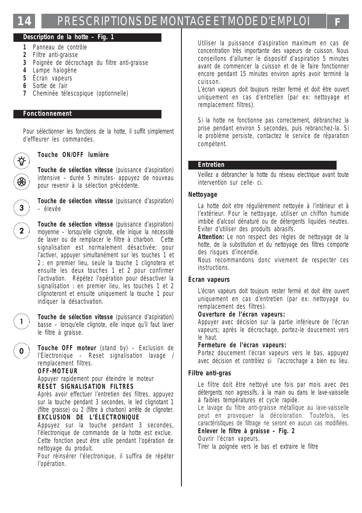 – élevée Touche de sélection vitesse (puissance d’aspiration) moyenne – lorsqu’elle clignote, elle inique la nécessité de laver ou de remplacer le filtre à charbon. Cette signalisation est normalement désactivée; pour l’activer, appuyer simultanément sur les touches 1 et 2 ; en premier lieu, seule la touche 1 clignotera et ensuite les deux touches 1 et 2 pour confirmer l’activation. Répétez l’opération pour désactiver la signalisation : en premier lieu, les touches 1 et 2 clignoteront et ensuite uniquement la touche 1 pour indiquer la désactivation. Touche de sélection vitesse (puissance d’aspiration) basse – lorsqu’elle clignote, elle inique qu’il faut laver le filtre à graisse. Touche OFF moteur (stand by) – Exclusion de l’Électronique – Reset signalisation lavage / remplacement filtres. OFF-MOTEUR Appuyer rapidement pour éteindre le moteur RESET SIGNALISATION FILTRES Après avoir effectuer l’entretien des filtres, appuyez sur la touche pendant 3 secondes, le led clignotant 1 (filtre graisse) ou 2 (filtre à charbon) arrête de clignoter. EXCLUSION DE L’ÉLECTRONIQUE Appuyez sur la touche pendant 3 secondes, l’électronique de commande de la hotte est exclue. Cette fonction peut être utile pendant l’opération de nettoyage du produit. Pour réinsérer l’électronique, il suffira de répéter l’opération.