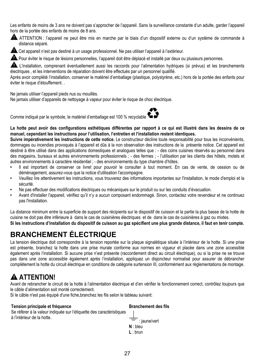 Les enfants de moins de 3 ans ne doivent pas s’approcher de l’appareil. Sans la surveillance constante d’un adulte, garder l’appareil hors de la portée des enfants de moins de 8 ans. ATTENTION : l’appareil ne peut être mis en marche par le biais d’un dispositif externe ou d’un système de commande à distance séparé. Cet appareil n’est pas destiné à un usage professionnel. Ne pas utiliser l’appareil à l’extérieur. Pour éviter le risque de lésions personnelles, l’appareil doit être déplacé et installé par deux ou plusieurs personnes. L'installation, comprenant éventuellement aussi les raccords pour l’alimentation hydriques (si prévus) et les branchements électriques , et les interventions de réparation doivent être effectués par un personnel qualifié. Après avoir complété l’installation, conserver le matériel d’emballage (plastique, polystyrène, etc.) hors de la portée des enfants pour éviter le risque d’étouffement. . Ne jamais utiliser l’appareil pieds nus ou mouillés. Ne jamais utiliser d’appareils de nettoyage à vapeur pour éviter le risque de choc électrique. Comme indiqué par le symbole, le matériel d’emballage est 100 % recyclable La hotte peut avoir des configurations esthétiques différentes par rapport à ce qui est illustré dans les dessins de ce manuel, cependant les instructions pour l’utilisation, l’entretien et l’installation restent identiques. Suivre impérativement les instructions de cette notice. Le constructeur décline toute responsabilité pour tous les inconvénients, dommages ou incendies provoqués à l’appareil et dûs à la non observation des instructions de la présente notice. Cet appareil est destiné à être utilisé dans des applications domestiques et analogues telles que : - des coins cuisines réservés au personnel dans des magasins, bureaux et autres environnements professionnels ; - des fermes ; - l’utilisation par les clients des hôtels, motels et autres environnements à caractère résidentiel ; - des environnements du type chambre d’hôtes.