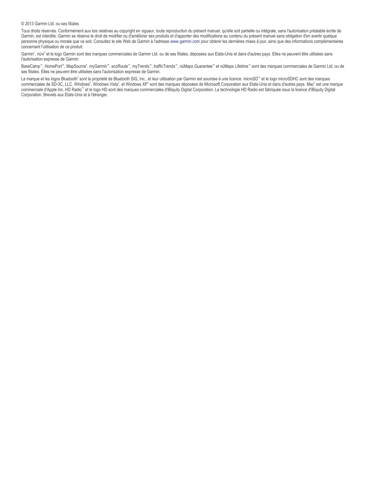 La marque et les logos Bluetooth sont la propriété de Bluetooth SIG, Inc., et leur utilisation par Garmin est soumise à une licence. microSD™ et le logo microSDHC sont des marques commerciales de SD-3C, LLC. Windows , Windows Vista , et Windows XP sont des marques déposées de Microsoft Corporation aux Etats-Unis et dans d'autres pays. Mac est une marque commerciale d'Apple Inc. HD Radio™ et le logo HD sont des marques commerciales d'iBiquity Digital Corporation. La technologie HD Radio est fabriquée sous la licence d'iBiquity Digital Corporation. Brevets aux Etats-Unis et à l'étranger.