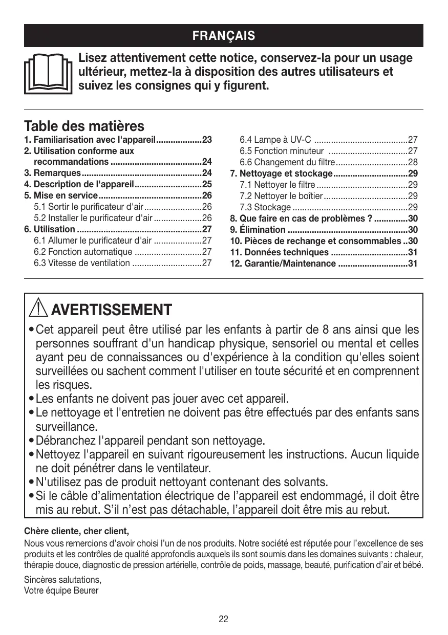 - Si le câble d’alimentation électrique de l’appareil est endommagé, il doit être mis au rebut. S’il n’est pas détachable, l’appareil doit être mis au rebut. Chère cliente, cher client, Nous vous remercions d’avoir choisi l’un de nos produits. Notre société est réputée pour l’excellence de ses produits et les contrôles de qualité approfondis auxquels ils sont soumis dans les domaines suivants : chaleur, thérapie douce, diagnostic de pression artérielle, contrôle de poids, massage, beauté, purification d’air et bébé. Sincères salutations, Votre équipe Beurer