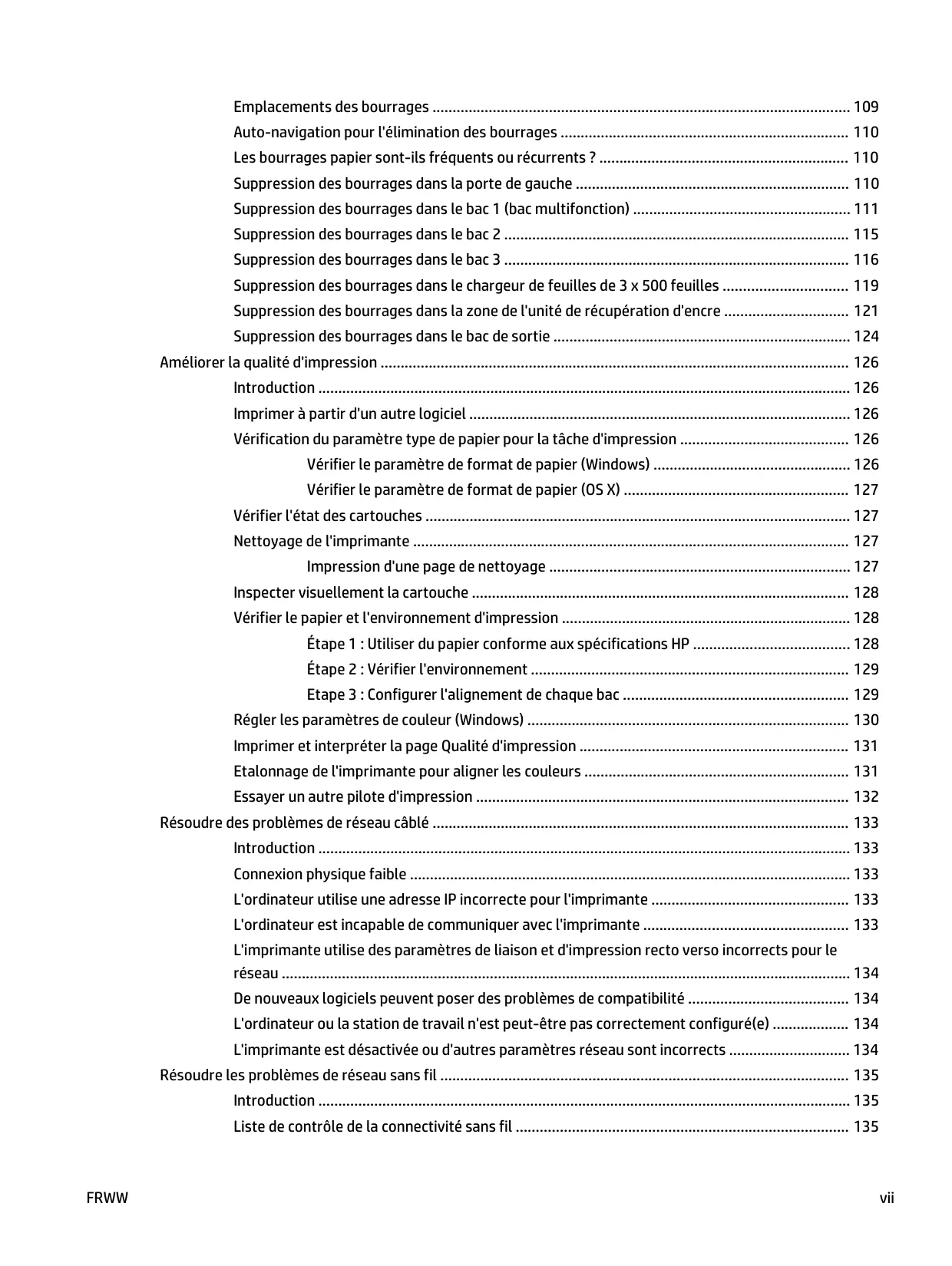 FRWW Emplacements des bourrages 109 Auto-navigation pour l'élimination des bourrages 110 Les bourrages papier sont-ils fréquents ou récurrents ? 110 Suppression des bourrages dans la porte de gauche 110 Suppression des bourrages dans le bac 1 (bac multifonction) 111 Suppression des bourrages dans le bac 2 115 Suppression des bourrages dans le bac 3 116 Suppression des bourrages dans le chargeur de feuilles de 3 x 500 feuilles 119 Suppression des bourrages dans la zone de l'unité de récupération d'encre 121 Suppression des bourrages dans le bac de sortie 124 Améliorer la qualité d'impression 126 Introduction 126 Imprimer à partir d'un autre logiciel 126 Vérification du paramètre type de papier pour la tâche d'impression 126 Vérifier le paramètre de format de papier (Windows) 126 Vérifier le paramètre de format de papier (OS X) 127 Vérifier l'état des cartouches 127 Nettoyage de l'imprimante 127 Impression d'une page de nettoyage 127 Inspecter visuellement la cartouche 128 Vérifier le papier et l'environnement d'impression 128 Étape 1 : Utiliser du papier conforme aux spécifications HP 128 Étape 2 : Vérifier l'environnement 129 Etape 3 : Configurer l'alignement de chaque bac 129 Régler les paramètres de couleur (Windows) 130 Imprimer et interpréter la page Qualité d'impression 131 Etalonnage de l'imprimante pour aligner les couleurs 131 Essayer un autre pilote d'impression 132 Résoudre des problèmes de réseau câblé 133 Introduction 133 Connexion physique faible 133 L'ordinateur utilise une adresse IP incorrecte pour l'imprimante 133 L'ordinateur est incapable de communiquer avec l'imprimante 133 L'imprimante utilise des paramètres de liaison et d'impression recto verso incorrects pour le réseau 134 De nouveaux logiciels peuvent poser des problèmes de compatibilité 134 L'ordinateur ou la station de travail n'est peut-être pas correctement configuré(e) 134 L'imprimante est désactivée ou d'autres paramètres réseau sont incorrects 134 Résoudre les problèmes de réseau sans fil 135 Introduction 135 Liste de contrôle de la connectivité sans fil 135