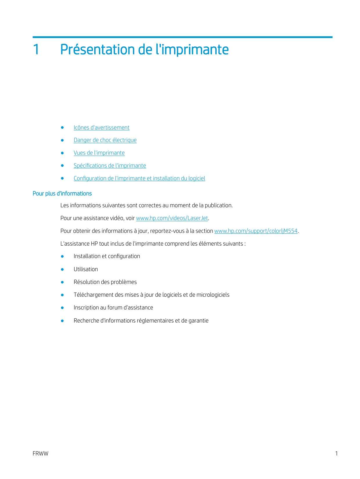 Configuration de l'imprimante et installation du logiciel Pour plus d'informations Les informations suivantes sont correctes au moment de la publication. Pour une assistance vidéo, voir www.hp.com/videos/LaserJet. Pour obtenir des informations à jour, reportez-vous à la section www.hp.com/support/colorljM554. L'assistance HP tout inclus de l'imprimante comprend les éléments suivants : FRWW