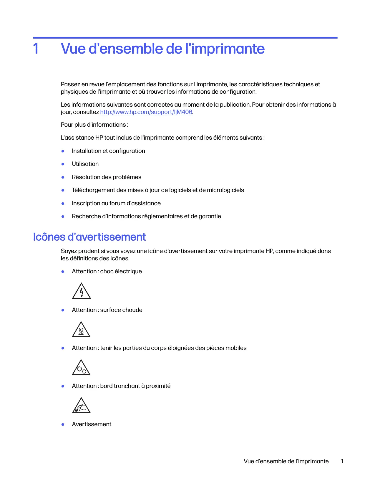 Vue d'ensemble de l'imprimante Passez en revue l'emplacement des fonctions sur l'imprimante, les caractéristiques techniques et physiques de l'imprimante et où trouver les informations de configuration. Les informations suivantes sont correctes au moment de la publication. Pour obtenir des informations à jour, consultez http://www.hp.com/support/ljM406. Pour plus d'informations : L'assistance HP tout inclus de l'imprimante comprend les éléments suivants :