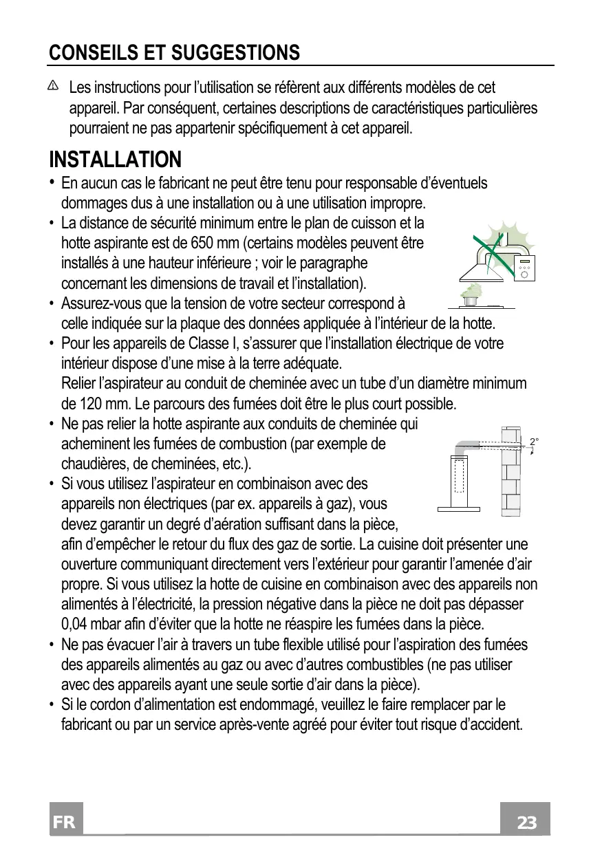 CONSIGLI E SUGGERIMENTI Le Istruzioni per l’uso si riferiscono ai diversi modelli di questo apparecchio. Pertanto, si potrebbero trovare descrizioni di singole caratteristiche che non appartengono al proprio apparecchio specifico. • La distance de sécurité minimum entre le plan de cuisson et la hotte aspirante est de 650 mm (certains modèles peuvent être installés à une hauteur inférieure ; voir le paragraphe concernant les dimensions de travail et l’installation). • Assurez-vous que la tension de votre secteur correspond à celle indiquée sur la plaque des données appliquée à l’intérieur de la hotte. • Pour les appareils de Classe I, s’assurer que l’installation électrique de votre intérieur dispose d’une mise à la terre adéquate. Relier l’aspirateur au conduit de cheminée avec un tube d’un diamètre minimum de 120 mm. Le parcours des fumées doit être le plus court possible. • Ne pas relier la hotte aspirante aux conduits de cheminée qui 2° acheminent les fumées de combustion (par exemple de chaudières, de cheminées, etc.). • Si vous utilisez l’aspirateur en combinaison avec des appareils non électriques (par ex. appareils à gaz), vous devez garantir un degré d’aération suffisant dans la pièce, afin d’empêcher le retour du flux des gaz de sortie. La cuisine doit présenter une ouverture communiquant directement vers l’extérieur pour garantir l’amenée d’air propre. Si vous utilisez la hotte de cuisine en combinaison avec des appareils non alimentés à l’électricité, la pression négative dans la pièce ne doit pas dépasser 0,04 mbar afin d’éviter que la hotte ne réaspire les fumées dans la pièce. • Ne pas évacuer l’air à travers un tube flexible utilisé pour l’aspiration des fumées des appareils alimentés au gaz ou avec d’autres combustibles (ne pas utiliser avec des appareils ayant une seule sortie d’air dans la pièce). • Si le cordon d’alimentation est endommagé, veuillez le faire remplacer par le fabricant ou par un service après-vente agréé pour éviter tout risque d’accident.