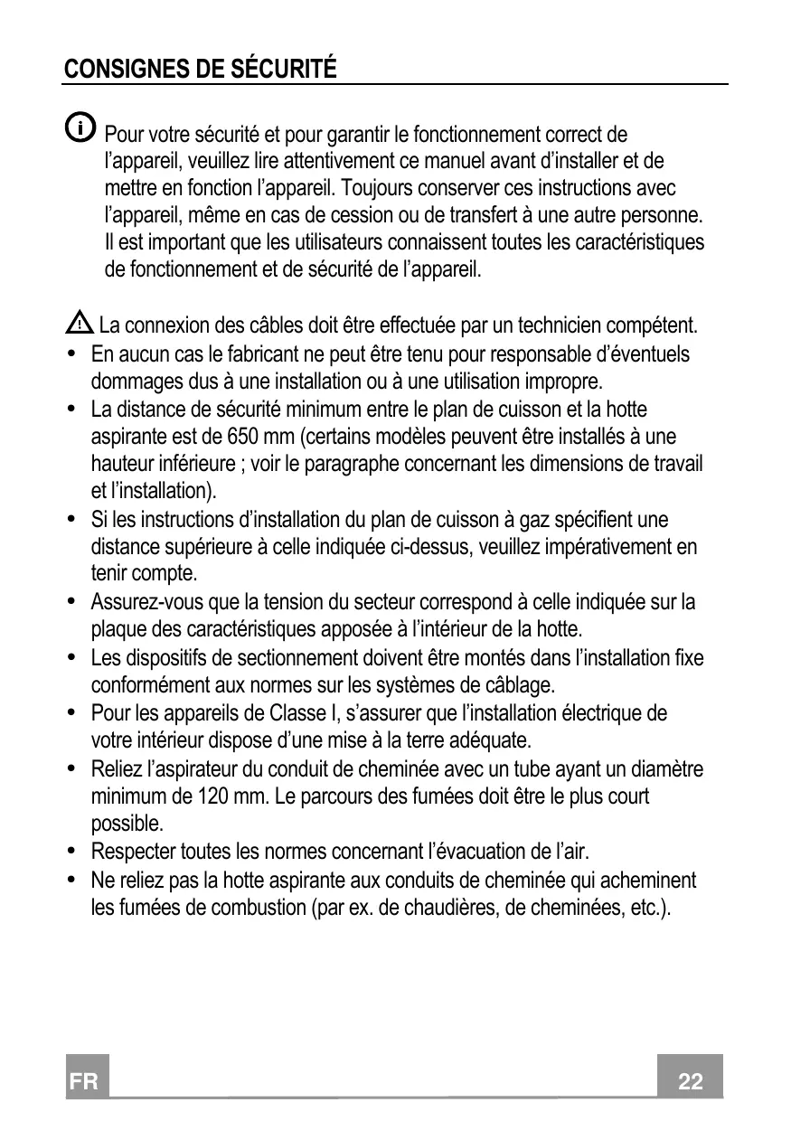 La distance de sécurité minimum entre le plan de cuisson et la hotte aspirante est de 650 mm (certains modèles peuvent être installés à une hauteur inférieure ; voir le paragraphe concernant les dimensions de travail et l’installation). Si les instructions d’installation du plan de cuisson à gaz spécifient une distance supérieure à celle indiquée ci-dessus, veuillez impérativement en tenir compte. Assurez-vous que la tension du secteur correspond à celle indiquée sur la plaque des caractéristiques apposée à l’intérieur de la hotte. Les dispositifs de sectionnement doivent être montés dans l’installation fixe conformément aux normes sur les systèmes de câblage. Pour les appareils de Classe I, s’assurer que l’installation électrique de votre intérieur dispose d’une mise à la terre adéquate. Reliez l’aspirateur du conduit de cheminée avec un tube ayant un diamètre minimum de 120 mm. Le parcours des fumées doit être le plus court possible. Respecter toutes les normes concernant l’évacuation de l’air. Ne reliez pas la hotte aspirante aux conduits de cheminée qui acheminent les fumées de combustion (par ex. de chaudières, de cheminées, etc.).