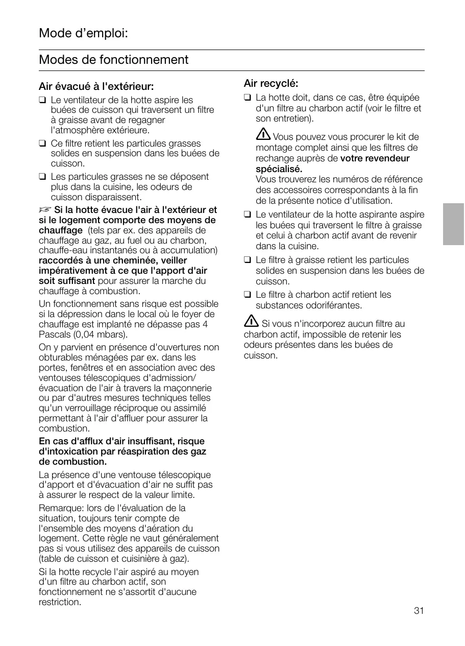 à graisse avant de regagner l'atmosphère extérieure. ❑ Ce filtre retient les particules grasses solides en suspension dans les buées de cuisson. ❑ Les particules grasses ne se déposent plus dans la cuisine, les odeurs de cuisson disparaissent. D Si la hotte évacue l'air à l'extérieur et si le logement comporte des moyens de chauffage (tels par ex. des appareils de chauffage au gaz, au fuel ou au charbon, chauffe-eau instantanés ou à accumulation) raccordés à une cheminée, veiller impérativement à ce que l'apport d'air soit suffisant pour assurer la marche du chauffage à combustion. Un fonctionnement sans risque est possible si la dépression dans le local où le foyer de chauffage est implanté ne dépasse pas 4 Pascals (0,04 mbars). On y parvient en présence d'ouvertures non obturables ménagées par ex. dans les portes, fenêtres et en association avec des ventouses télescopiques d'admission/ évacuation de l'air à travers la maçonnerie ou par d'autres mesures techniques telles qu'un verrouillage réciproque ou assimilé permettant à l'air d'affluer pour assurer la combustion. En cas d'afflux d'air insuffisant, risque d'intoxication par réaspiration des gaz de combustion. La présence d'une ventouse télescopique d'apport et d'évacuation d'air ne suffit pas à assurer le respect de la valeur limite. Remarque: lors de l'évaluation de la situation, toujours tenir compte de l'ensemble des moyens d'aération du logement. Cette règle ne vaut généralement pas si vous utilisez des appareils de cuisson (table de cuisson et cuisinière à gaz). Si la hotte recycle l'air aspiré au moyen d'un filtre au charbon actif, son fonctionnement ne s'assortit d'aucune restriction.