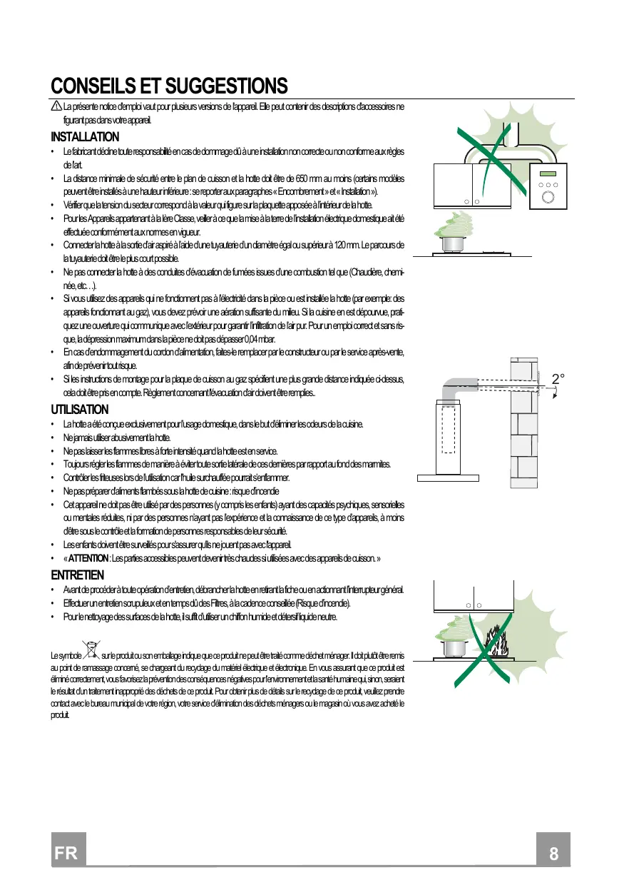 1.1 - N’utilisez jamais pour le raccordement une cheminée servant de conduit de fumée (chaudières, cheminées, etc...) 1.2 - Vérifiez que la tension du secteur soit identique aux valeurs indiquées sur la plaquette signalétique figurant à l’intérieur de la hotte. 1.3 - Reliez la hotte au réseau en interposant un interrupteur bipolaire avec ouverture des contacts de 3 mm au moins. 1.4 - Pour les hottes avec cable de mise à la terre assurez-vous que l’installation électrique de votre logement ait une mise à la terre correcte. 1.5 - Les hottes en classe II ont un double isolement; elles ne doivent donc pas être branchées avec une fiche équiée de mise à la terre mais avec une simple fiche bipolaire. 1.6 - La distance de sûreté minimum entre le plan de cuisson et la hotte est de 65 cm. 1.7 - Il est interdit de faire flamber des préparations sous la hotte. 1.8 - Lorsque des fritures sont effectuées sous la hotte en fonctionnement, elles doivent faire l’objet d’une surveillance permanente: l’huile surchauffée pourrait s’enflammer. 1.9 - Avant d’effectuer le nettoyage ou l’entretien de la hotte, débranchez l’appareil ou agissez sur l’interrupteur omnipolaire de votre installation. 1.10- Une ventilation convenable de la pièce doit être prévue si une hotte de cuisine et des appareils alimentés par une énergie autre que l’énergie électrique évacuent les fumées simultanément. Une utilisation sans dangers est possible si la dépression maximum qui se crée dans la pièce est inférieure à 0,04 mbar, ce que évite un retour des gaz de décharge dans la pièce. 1.11- L’appareil doit être placé de façon telle que la fiche de prise de courant soit accessible. 1.12- Si le câble d’alimentation est endommagé, il doit être remplace par un câble ou un ensemble spécial disponible auprés du fabricant ou son service après vente. 1.13- Cet appareil ne doit pas être utilisé par des personnes (y compris les enfants) ayant des capacités psychiques, sensorielles ou mentales réduites, ni par des personnes n’ayant pas l’expérience et la connaissance de ce type d’appareils, à moins d'être sous le contrôle et la formation de personnes responsables de leur sécurité. 1.14- Les enfants doivent être surveillés pour s'assurer qu'ils ne jouent pas avec l'appareil.