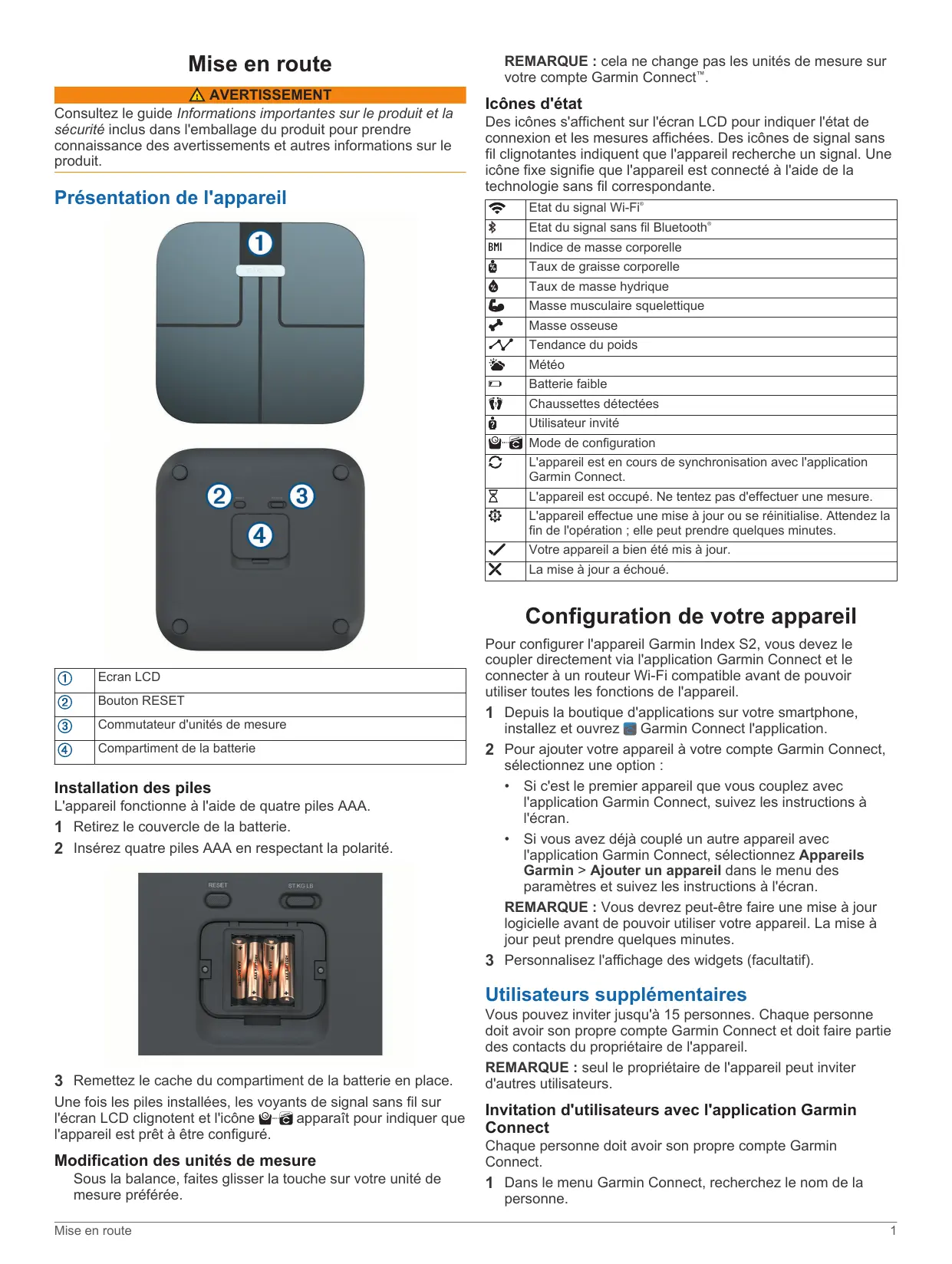 - Si vous avez déjà couplé un autre appareil avec l'application Garmin Connect, sélectionnez Appareils Garmin > Ajouter un appareil dans le menu des paramètres et suivez les instructions à l'écran. REMARQUE : Vous devrez peut-être faire une mise à jour logicielle avant de pouvoir utiliser votre appareil. La mise à jour peut prendre quelques minutes. 3 Personnalisez l'affichage des widgets (facultatif). Utilisateurs supplémentaires 3 Remettez le cache du compartiment de la batterie en place. Vous pouvez inviter jusqu'à 15 personnes. Chaque personne doit avoir son propre compte Garmin Connect et doit faire partie des contacts du propriétaire de l'appareil. REMARQUE : seul le propriétaire de l'appareil peut inviter d'autres utilisateurs. Une fois les piles installées, les voyants de signal sans fil sur l'écran LCD clignotent et l'icône apparaît pour indiquer que l'appareil est prêt à être configuré. Invitation d'utilisateurs avec l'application Garmin Connect Modification des unités de mesure Sous la balance, faites glisser la touche sur votre unité de mesure préférée. Mise en route Chaque personne doit avoir son propre compte Garmin Connect. 1 Dans le menu Garmin Connect, recherchez le nom de la personne.