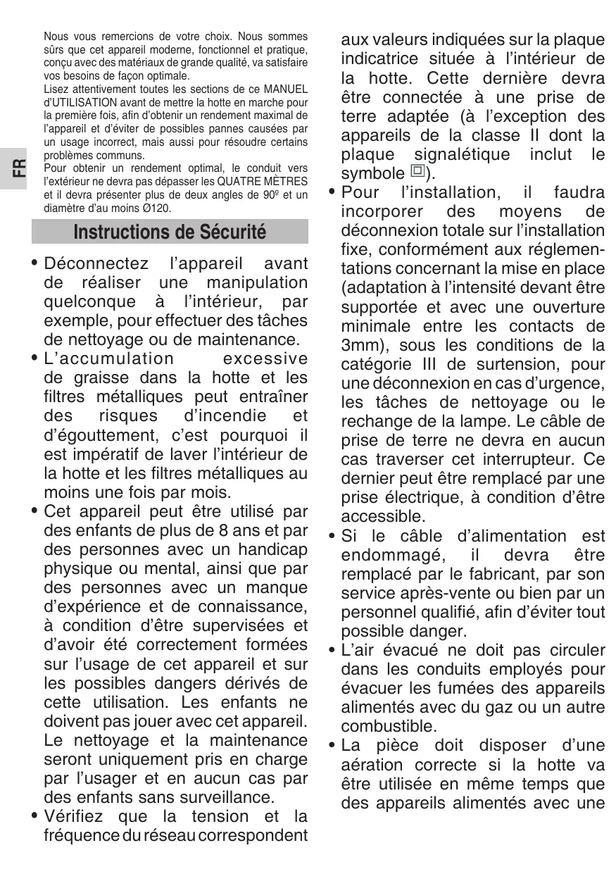 Nous vous remercions de votre choix. Nous sommes sûrs que cet appareil moderne, fonctionnel et pratique, conçu avec des matériaux de grande qualité, va satisfaire vos besoins de façon optimale. Lisez attentivement toutes les sections de ce MANUEL d’UTILISATION avant de mettre la hotte en marche pour la première fois, afin d’obtenir un rendement maximal de l’appareil et d’éviter de possibles pannes causées par un usage incorrect, mais aussi pour résoudre certains problèmes communs. Pour obtenir un rendement optimal, le conduit vers l’extérieur ne devra pas dépasser les QUATRE MÈTRES et il devra présenter plus de deux angles de 90º et un diamètre d’au moins Ø120.