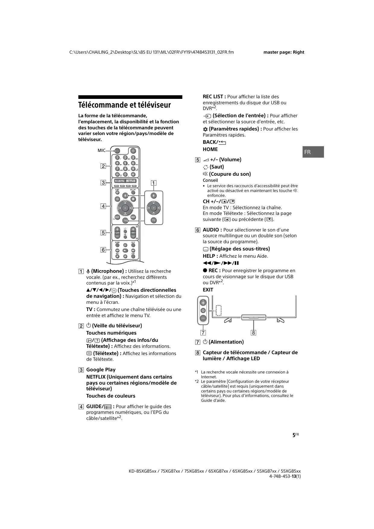 - Lorsque vous transportez le téléviseur pour le porter à réparer ou lorsque vous déménagez, glissez-le dans son emballage et son carton d’origine. 8 mm – 12 mm Vis (M6) Support de fixation murale Couvercle arrière du téléviseur KD-75/65/55XG87xx, KD-75/65/55XG85xx 10 mm – 13 mm Vis (M6) Support de fixation murale Couvercle arrière du téléviseur 3FR KD-85XG85xx / 75XG87xx / 75XG85xx / 65XG87xx / 65XG85xx / 55XG87xx / 55XG85xx 4-748-453-13(1) C:\Users\CHAILING_2\Desktop\SL\85 EU 131\ML\02FR\FY19\4748453131_02FR.fm Prévention des basculements master page: Left KD-75/65/55XG87xx, KD-75/65/55XG85xx KD-85XG85xx 10 mm – 13 mm 8 mm – 12 mm Vis M6 (non fournie) Vis M6 (non fournie) 1,5 N·m {15 kgf·cm} 1,5 N·m {15 kgf·cm} Cordon (non fourni) Vis (non fournie) Cordon (non fourni) Vis (non fournie) 4FR KD-85XG85xx / 75XG87xx / 75XG85xx / 65XG87xx / 65XG85xx / 55XG87xx / 55XG85xx 4-748-453-13(1) C:\Users\CHAILING_2\Desktop\SL\85 EU 131\ML\02FR\FY19\4748453131_02FR.fm master page: Right REC LIST : Pour afficher la liste des Télécommande et téléviseur enregistrements du disque dur USB ou DVR*2. La forme de la télécommande, l’emplacement, la disponibilité et la fonction des touches de la télécommande peuvent varier selon votre région/pays/modèle de téléviseur. (Sélection de l’entrée) : Pour afficher et sélectionner la source d’entrée, etc. MIC (Paramètres rapides) : Pour afficher les Paramètres rapides. BACK/ HOME