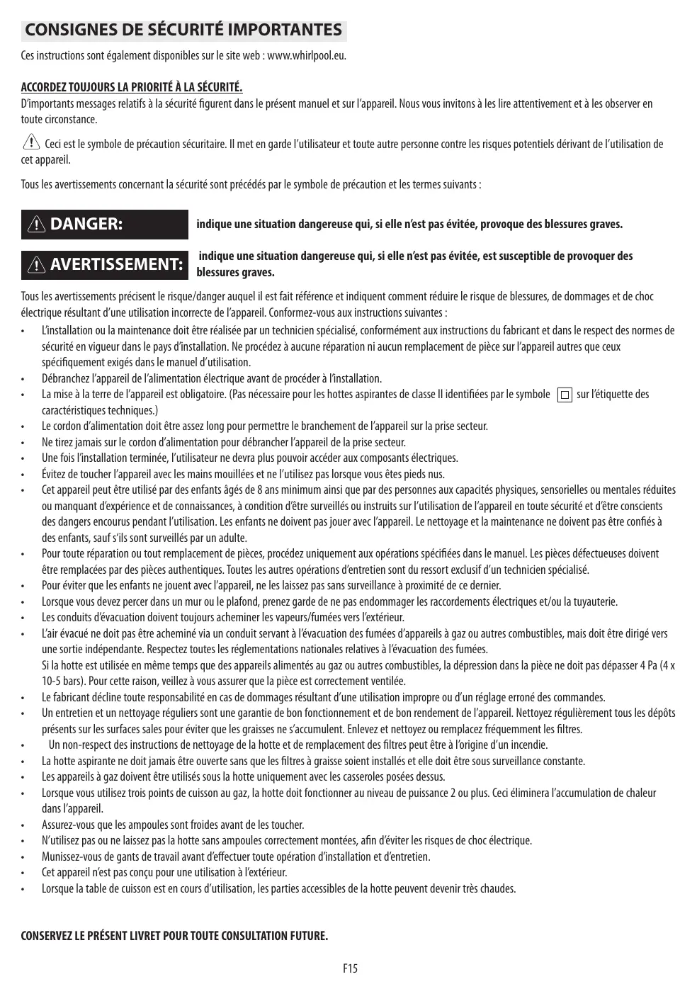 électrique résultant d’une utilisation incorrecte de l’appareil. Conformez-vous aux instructions suivantes : • L’installation ou la maintenance doit être réalisée par un technicien spécialisé, conformément aux instructions du fabricant et dans le respect des normes de sécurité en vigueur dans le pays d’installation. Ne procédez à aucune réparation ni aucun remplacement de pièce sur l’appareil autres que ceux spécifiquement exigés dans le manuel d’utilisation. • Débranchez l’appareil de l’alimentation électrique avant de procéder à l’installation. • La mise à la terre de l’appareil est obligatoire. (Pas nécessaire pour les hottes aspirantes de classe II identifiées par le symbole sur l’étiquette des caractéristiques techniques.) • Le cordon d’alimentation doit être assez long pour permettre le branchement de l’appareil sur la prise secteur. • Ne tirez jamais sur le cordon d’alimentation pour débrancher l’appareil de la prise secteur. • Une fois l’installation terminée, l’utilisateur ne devra plus pouvoir accéder aux composants électriques. • Évitez de toucher l’appareil avec les mains mouillées et ne l’utilisez pas lorsque vous êtes pieds nus. • Cet appareil peut être utilisé par des enfants âgés de 8 ans minimum ainsi que par des personnes aux capacités physiques, sensorielles ou mentales réduites ou manquant d’expérience et de connaissances, à condition d’être surveillés ou instruits sur l’utilisation de l’appareil en toute sécurité et d’être conscients des dangers encourus pendant l’utilisation. Les enfants ne doivent pas jouer avec l’appareil. Le nettoyage et la maintenance ne doivent pas être confiés à des enfants, sauf s‘ils sont surveillés par un adulte. • Pour toute réparation ou tout remplacement de pièces, procédez uniquement aux opérations spécifiées dans le manuel. Les pièces défectueuses doivent être remplacées par des pièces authentiques. Toutes les autres opérations d’entretien sont du ressort exclusif d’un technicien spécialisé. • Pour éviter que les enfants ne jouent avec l’appareil, ne les laissez pas sans surveillance à proximité de ce dernier. • Lorsque vous devez percer dans un mur ou le plafond, prenez garde de ne pas endommager les raccordements électriques et/ou la tuyauterie. • Les conduits d’évacuation doivent toujours acheminer les vapeurs/fumées vers l’extérieur. • L’air évacué ne doit pas être acheminé via un conduit servant à l’évacuation des fumées d’appareils à gaz ou autres combustibles, mais doit être dirigé vers une sortie indépendante. Respectez toutes les réglementations nationales relatives à l’évacuation des fumées. Si la hotte est utilisée en même temps que des appareils alimentés au gaz ou autres combustibles, la dépression dans la pièce ne doit pas dépasser 4 Pa (4 x 10-5 bars). Pour cette raison, veillez à vous assurer que la pièce est correctement ventilée. • Le fabricant décline toute responsabilité en cas de dommages résultant d’une utilisation impropre ou d’un réglage erroné des commandes. • Un entretien et un nettoyage réguliers sont une garantie de bon fonctionnement et de bon rendement de l’appareil. Nettoyez régulièrement tous les dépôts présents sur les surfaces sales pour éviter que les graisses ne s’accumulent. Enlevez et nettoyez ou remplacez fréquemment les filtres. • Un non-respect des instructions de nettoyage de la hotte et de remplacement des filtres peut être à l’origine d’un incendie. • La hotte aspirante ne doit jamais être ouverte sans que les filtres à graisse soient installés et elle doit être sous surveillance constante. • Les appareils à gaz doivent être utilisés sous la hotte uniquement avec les casseroles posées dessus. • Lorsque vous utilisez trois points de cuisson au gaz, la hotte doit fonctionner au niveau de puissance 2 ou plus. Ceci éliminera l’accumulation de chaleur dans l’appareil. • Assurez-vous que les ampoules sont froides avant de les toucher. • N’utilisez pas ou ne laissez pas la hotte sans ampoules correctement montées, afin d’éviter les risques de choc électrique. • Munissez-vous de gants de travail avant d’effectuer toute opération d’installation et d’entretien. • Cet appareil n’est pas conçu pour une utilisation à l’extérieur. • Lorsque la table de cuisson est en cours d’utilisation, les parties accessibles de la hotte peuvent devenir très chaudes.