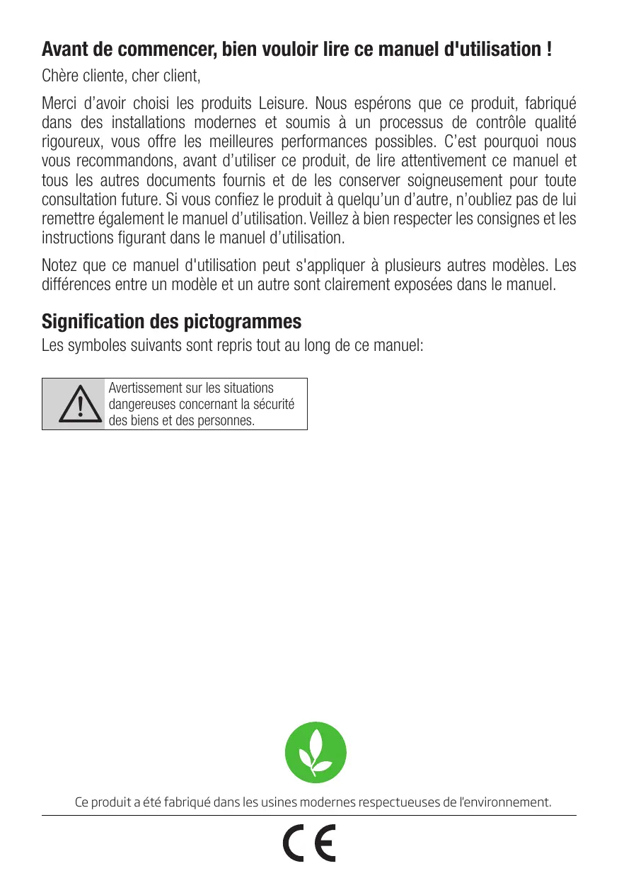 Merci d'avoir choisi les produits Leisure. Nous espérons que ce produit, fabriqué dans des installations modernes et soumis à un processus de contrôle qualité rigoureux, vous offre les meilleures performances possibles. C'est pourquoi nous vous recommandons, avant d'utiliser ce produit, de lire attentivement ce manuel et tous les autres documents fournis et de les conserver soigneusement pour toute consultation future. Si vous confiez le produit à quelqu'un d'autre, n'oubliez pas de lui remettre également le manuel d'utilisation. Veillez à bien respecter les consignes et les instructions figurant dans le manuel d'utilisation.