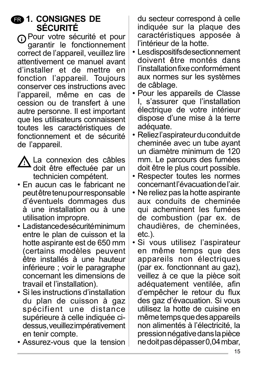 Lesdispositifsdesectionnement doivent être montés dans l’installation fixe conformément aux normes sur les systèmes de câblage. Pour les appareils de Classe I, s’assurer que l’installation électrique de votre intérieur dispose d’une mise à la terre adéquate. Reliez l’aspirateur du conduit de cheminée avec un tube ayant un diamètre minimum de 120 mm. Le parcours des fumées doit être le plus court possible. Respecter toutes les normes concernant l’évacuation de l’air. Ne reliez pas la hotte aspirante aux conduits de cheminée qui acheminent les fumées de combustion (par ex. de chaudières, de cheminées, etc.). Si vous utilisez l’aspirateur en même temps que des appareils non électriques (par ex. fonctionnant au gaz), veillez à ce que la pièce soit adéquatement ventilée, afin d’empêcher le retour du flux des gaz d’évacuation. Si vous utilisez la hotte de cuisine en même temps que des appareils non alimentés à l’électricité, la pression négative dans la pièce ne doit pas dépasser 0,04 mbar, 15