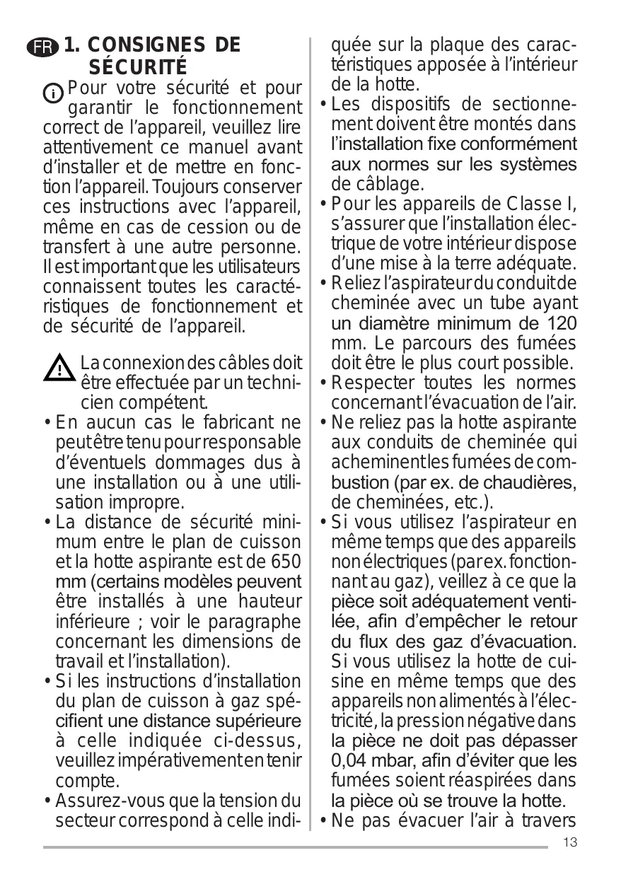 Les dispositifs de sectionnement doivent être montés dans O¶LQVWDOODWLRQ¿[HFRQIRUPpPHQW DX[ QRUPHV VXU OHV V\VWqPHV de câblage. Pour les appareils de Classe I, s’assurer que l’installation électrique de votre intérieur dispose d’une mise à la terre adéquate. Reliez l’aspirateur du conduit de cheminée avec un tube ayant XQ GLDPqWUH PLQLPXP GH mm. Le parcours des fumées doit être le plus court possible. Respecter toutes les normes concernant l’évacuation de l’air. Ne reliez pas la hotte aspirante aux conduits de cheminée qui acheminent les fumées de comEXVWLRQ SDUH[GHFKDXGLqUHV de cheminées, etc.). Si vous utilisez l’aspirateur en même temps que des appareils non électriques (par ex. fonctionnant au gaz), veillez à ce que la SLqFHVRLWDGpTXDWHPHQWYHQWLOpH D¿Q G¶HPSrFKHU OH UHWRXU GX ÀX[ GHV JD] G¶pYDFXDWLRQ Si vous utilisez la hotte de cuisine en même temps que des appareils non alimentés à l’électricité, la pression négative dans ODSLqFHQHGRLWSDVGpSDVVHU PEDUD¿QG¶pYLWHUTXHOHV fumées soient réaspirées dans ODSLqFHRVHWURXYHODKRWWH Ne pas évacuer l’air à travers 13