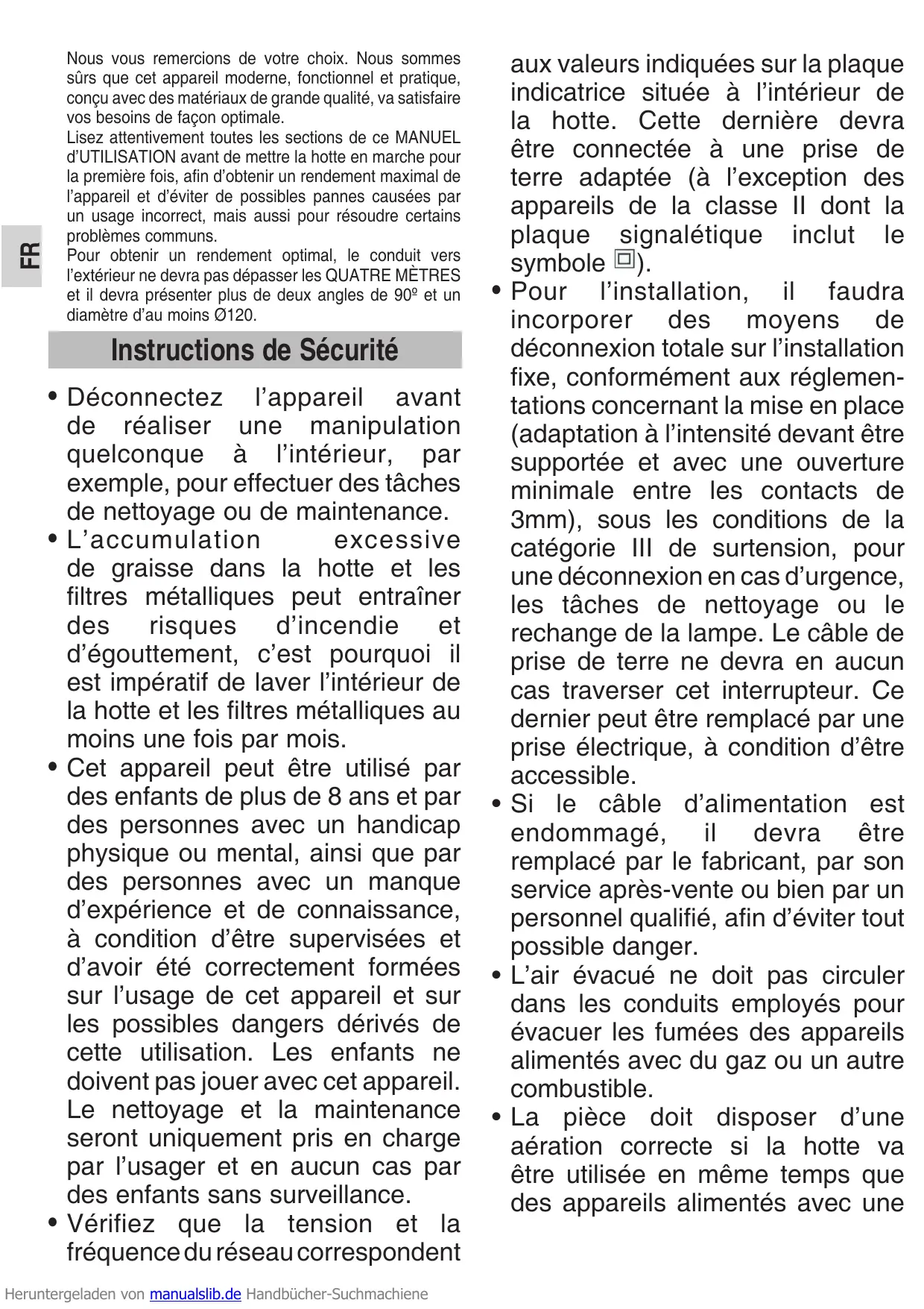 • L’accumulation excessive de graisse dans la hotte et les filtres métalliques peut entraîner des risques d’incendie et d’égouttement, c’est pourquoi il est impératif de laver l’intérieur de la hotte et les filtres métalliques au moins une fois par mois. • Cet appareil peut être utilisé par des enfants de plus de 8 ans et par des personnes avec un handicap physique ou mental, ainsi que par des personnes avec un manque d’expérience et de connaissance, à condition d’être supervisées et d’avoir été correctement formées sur l’usage de cet appareil et sur les possibles dangers dérivés de cette utilisation. Les enfants ne doivent pas jouer avec cet appareil. Le nettoyage et la maintenance seront uniquement pris en charge par l’usager et en aucun cas par des enfants sans surveillance. • Vérifiez que la tension et la fréquence du réseau correspondent Heruntergeladen von manualslib.de Handbücher-Suchmachiene