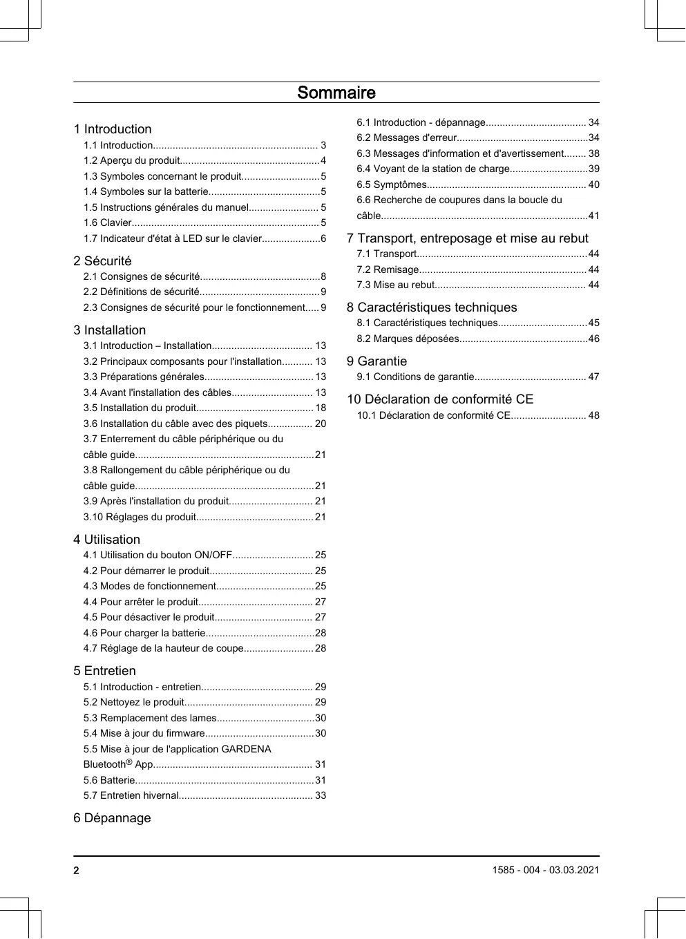 Dommages causés par l'infiltration d'eau lors de l'utilisation d'un nettoyeur à haute pression ou de l'immersion sous l'eau, par exemple, lorsque de fortes pluies forment des flaques d'eau. Dommages provoqués par la foudre. Dommages causés par un stockage inapproprié ou une manipulation incorrecte de la batterie. Dommages provoqués par l'utilisation d'une batterie qui ne serait pas d'origine GARDENA. Dommages provoqués par l'utilisation de pièces de rechange et d'accessoires autres que ceux d'origine GARDENA, tels que les lames et le matériel d'installation. Dommages sur la boucle du câble. Dommages causés par des changements ou modifications non autorisés sur le produit ou sur son alimentation. Les lames et les roues sont considérées comme des éléments consommables et ne sont pas couvertes par la garantie. Si vous rencontrez un problème lié à votre produit GARDENA, contactez le service clientèle GARDENA pour en savoir plus. Gardez le reçu et le numéro de série du produit à portée de main lorsque vous contactez le service clientèle GARDENA. 1585 - 004 - 03.03.2021 Garantie - 47 10 Déclaration de conformité CE