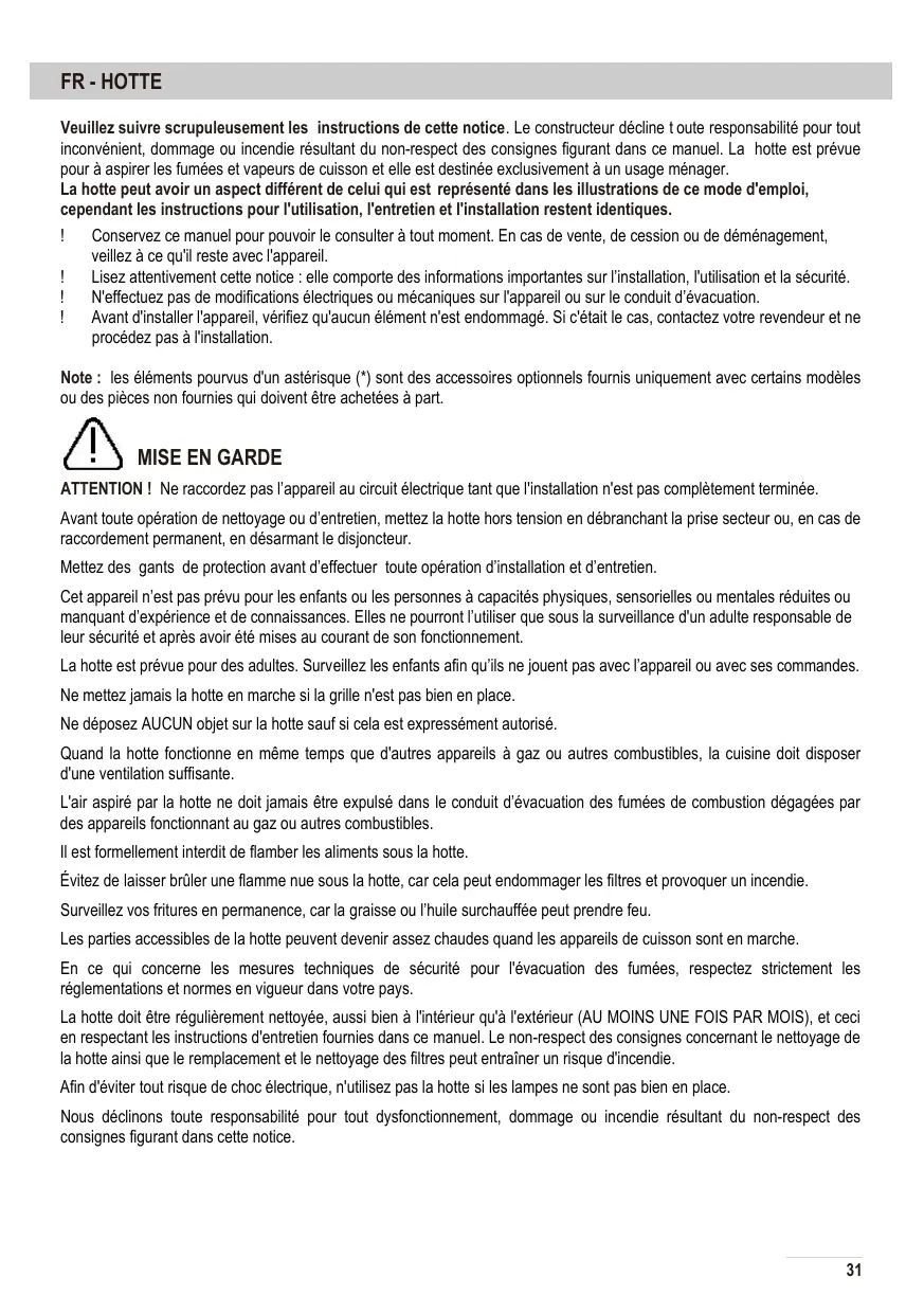 Avant toute opération de nettoyage ou d’entretien, mettez la hotte hors tension en débranchant la prise secteur ou, en cas de raccordement permanent, en désarmant le disjoncteur. Mettez des gants de protection avant d’effectuer toute opération d’installation et d’entretien. Cet appareil n’est pas prévu pour les enfants ou les personnes à capacités physiques, sensorielles ou mentales réduites ou manquant d’expérience et de connaissances. Elles ne pourront l’utiliser que sous la surveillance d'un adulte responsable de leur sécurité et après avoir été mises au courant de son fonctionnement. La hotte est prévue pour des adultes. Surveillez les enfants afin qu’ils ne jouent pas avec l’appareil ou avec ses commandes. Ne mettez jamais la hotte en marche si la grille n'est pas bien en place. Ne déposez AUCUN objet sur la hotte sauf si cela est expressément autorisé. Quand la hotte fonctionne en même temps que d'autres appareils à gaz ou autres combustibles, la cuisine doit disposer d'une ventilation suffisante. L'air aspiré par la hotte ne doit jamais être expulsé dans le conduit d’évacuation des fumées de combustion dégagées par des appareils fonctionnant au gaz ou autres combustibles. Il est formellement interdit de flamber les aliments sous la hotte. Évitez de laisser brûler une flamme nue sous la hotte, car cela peut endommager les filtres et provoquer un incendie. Surveillez vos fritures en permanence, car la graisse ou l’huile surchauffée peut prendre feu. Les parties accessibles de la hotte peuvent devenir assez chaudes quand les appareils de cuisson sont en marche. En ce qui concerne les mesures techniques de sécurité pour l'évacuation des fumées, respectez strictement les réglementations et normes en vigueur dans votre pays. La hotte doit être régulièrement nettoyée, aussi bien à l'intérieur qu'à l'extérieur (AU MOINS UNE FOIS PAR MOIS), et ceci en respectant les instructions d'entretien fournies dans ce manuel. Le non-respect des consignes concernant le nettoyage de la hotte ainsi que le remplacement et le nettoyage des filtres peut entraîner un risque d'incendie. Afin d'éviter tout risque de choc électrique, n'utilisez pas la hotte si les lampes ne sont pas bien en place. Nous déclinons toute responsabilité pour tout dysfonctionnement, dommage ou incendie résultant du non-respect des consignes figurant dans cette notice.